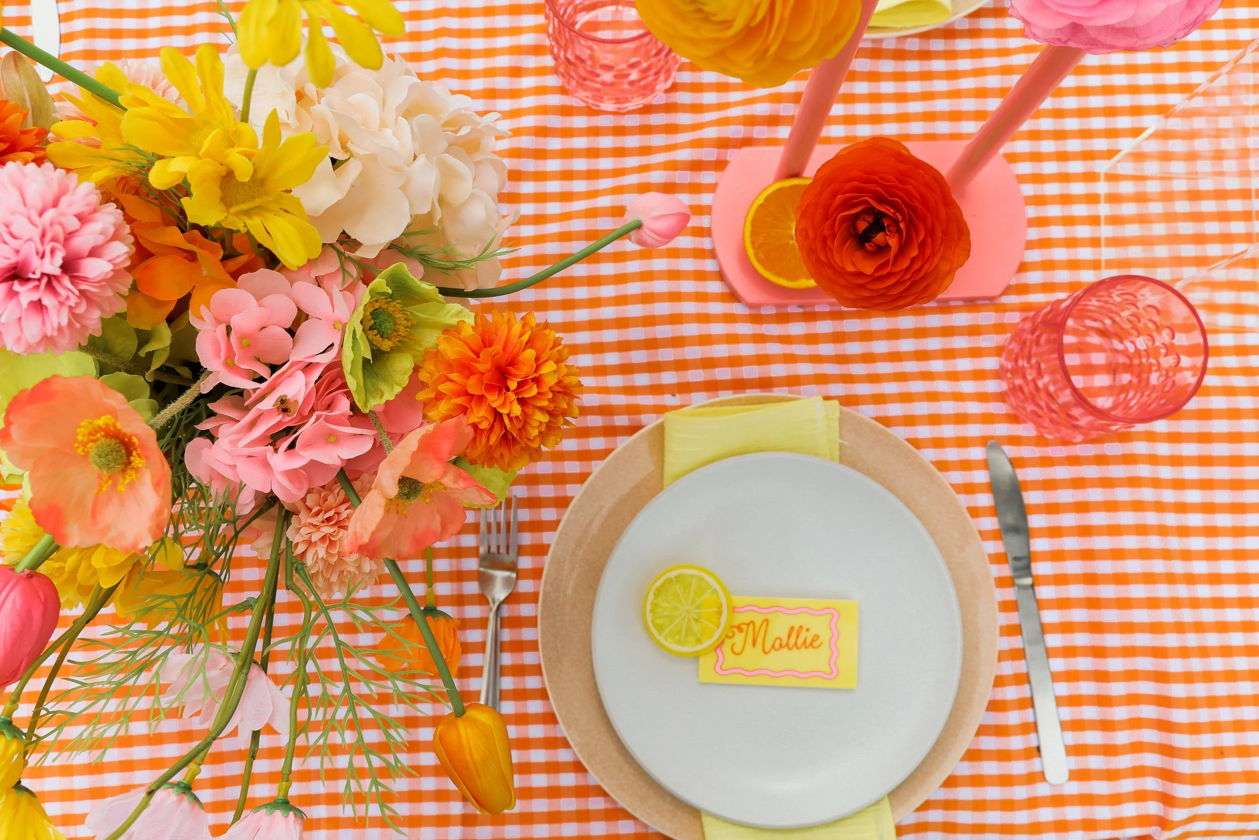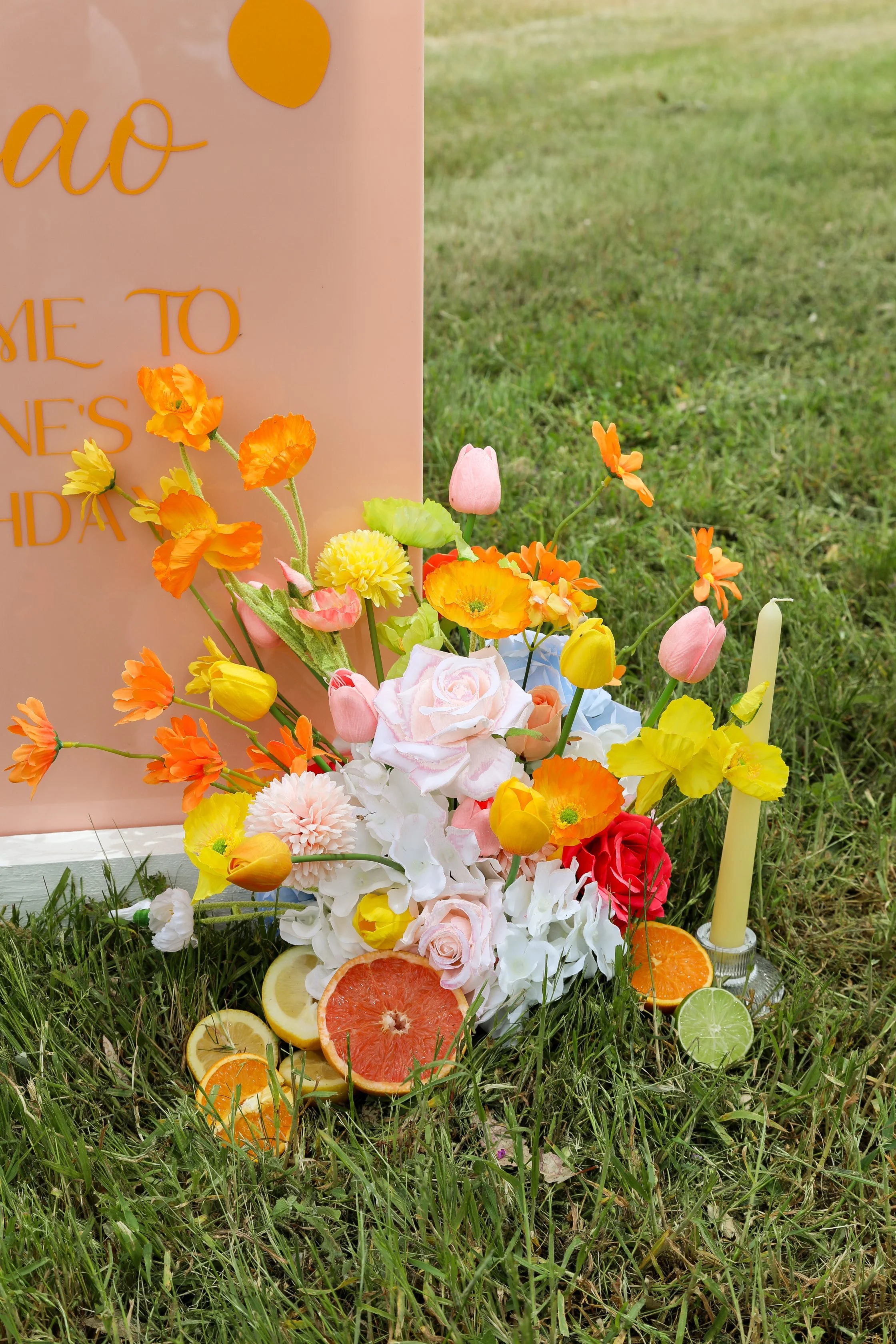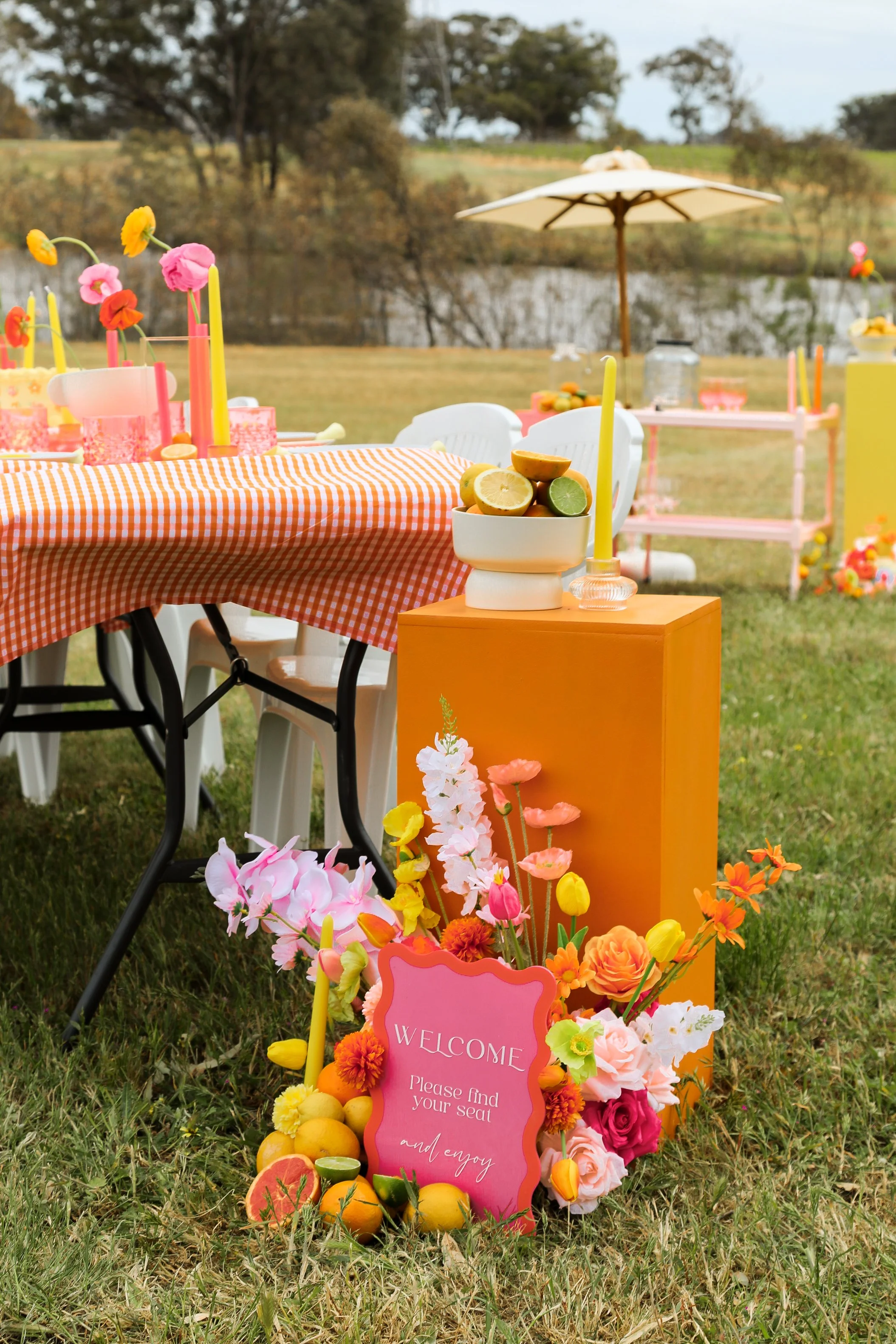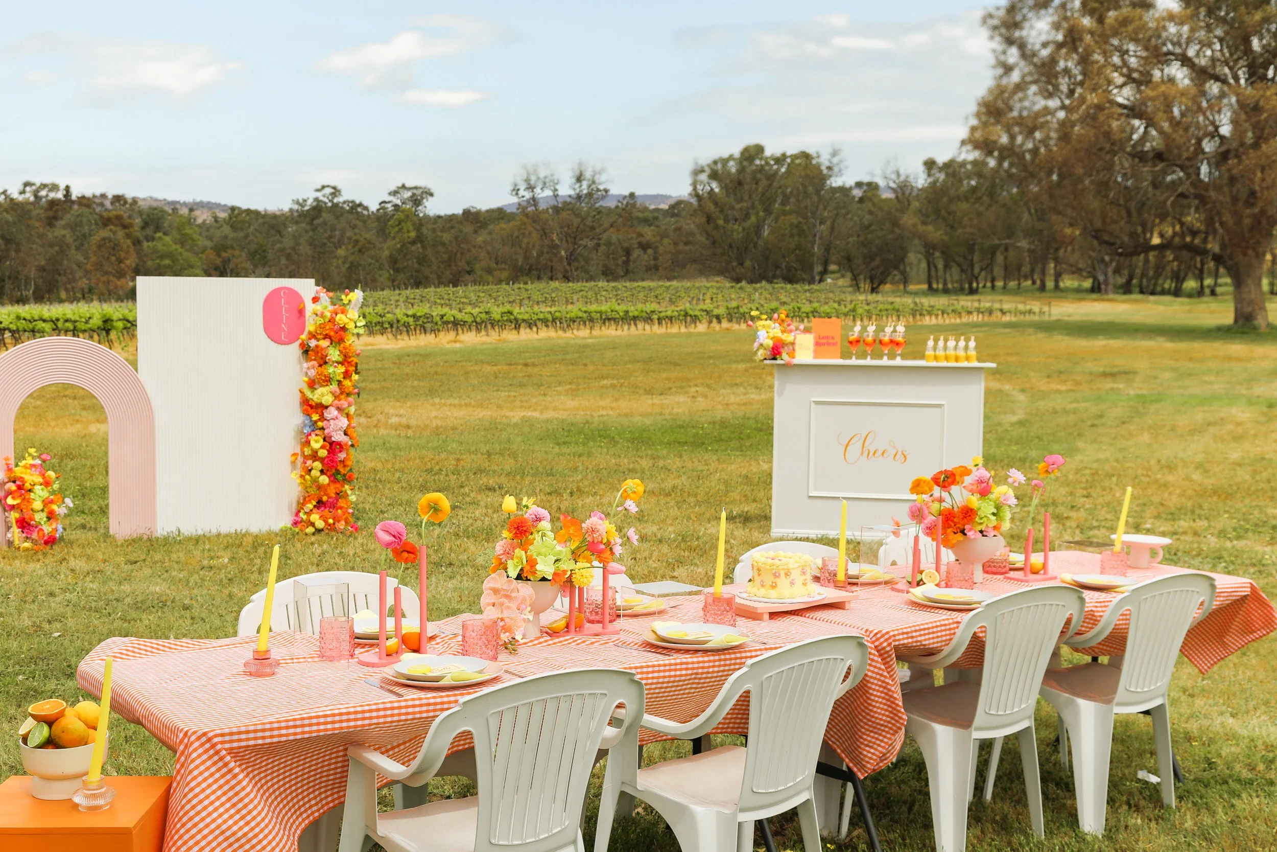 For Celine’s birthday celebration, we curated a vibrant citrus-themed soiree. The colour palette featured shades of pink, orange, yellow, and greens, mirroring the hues found in citrus fruits. We styled the tables with patterned gingham tablecloths and bright floral arrangements bursting with poppies and tulips.