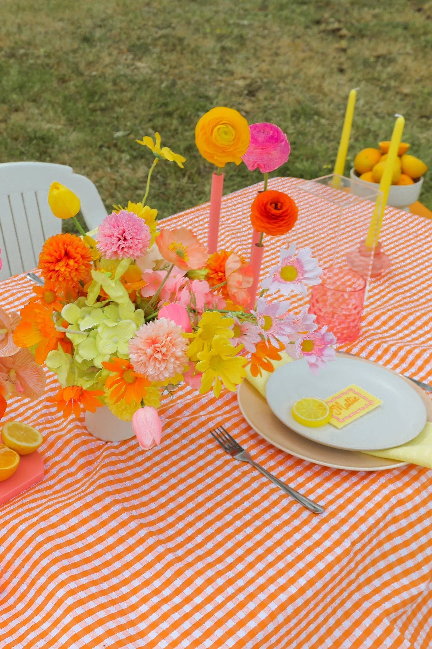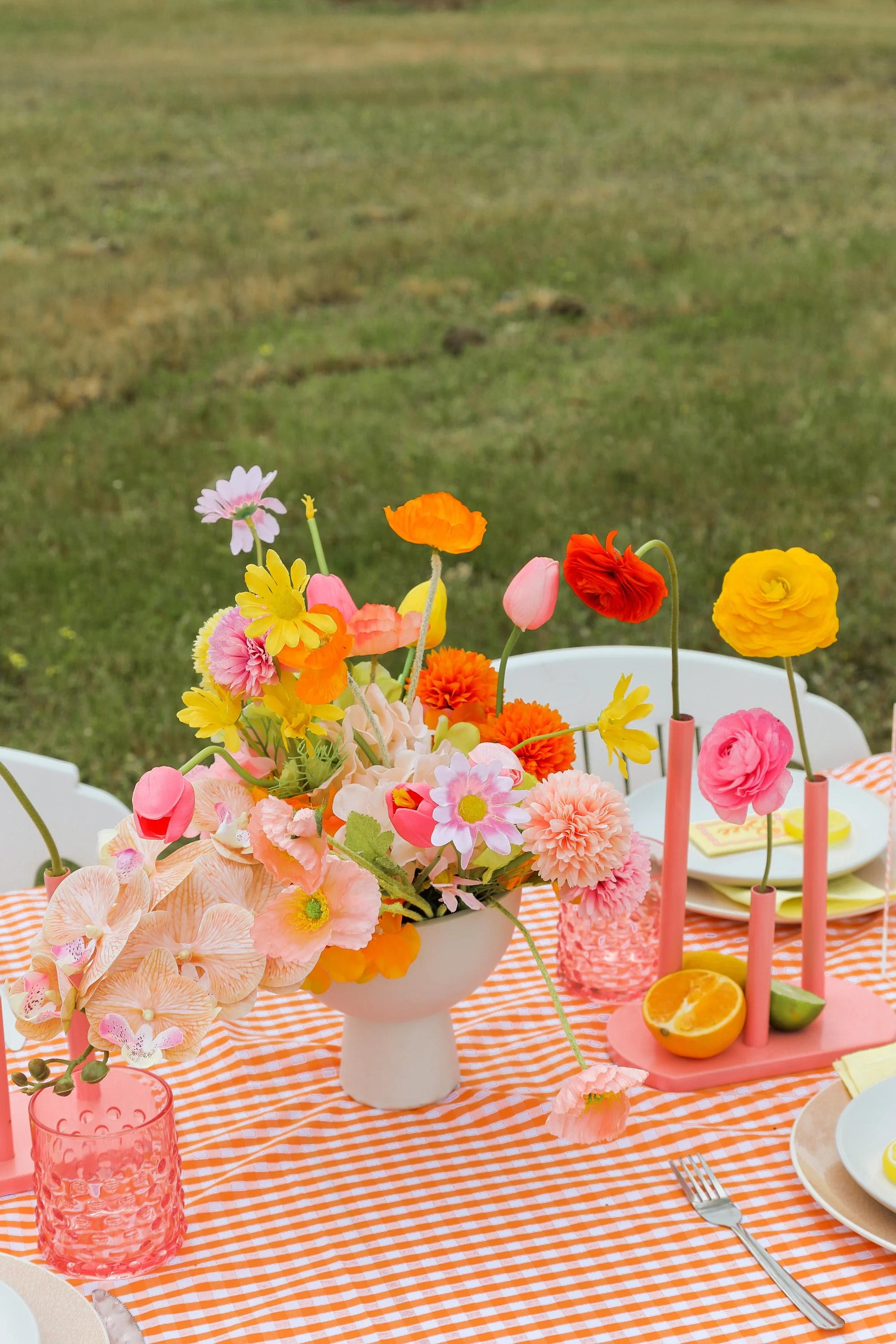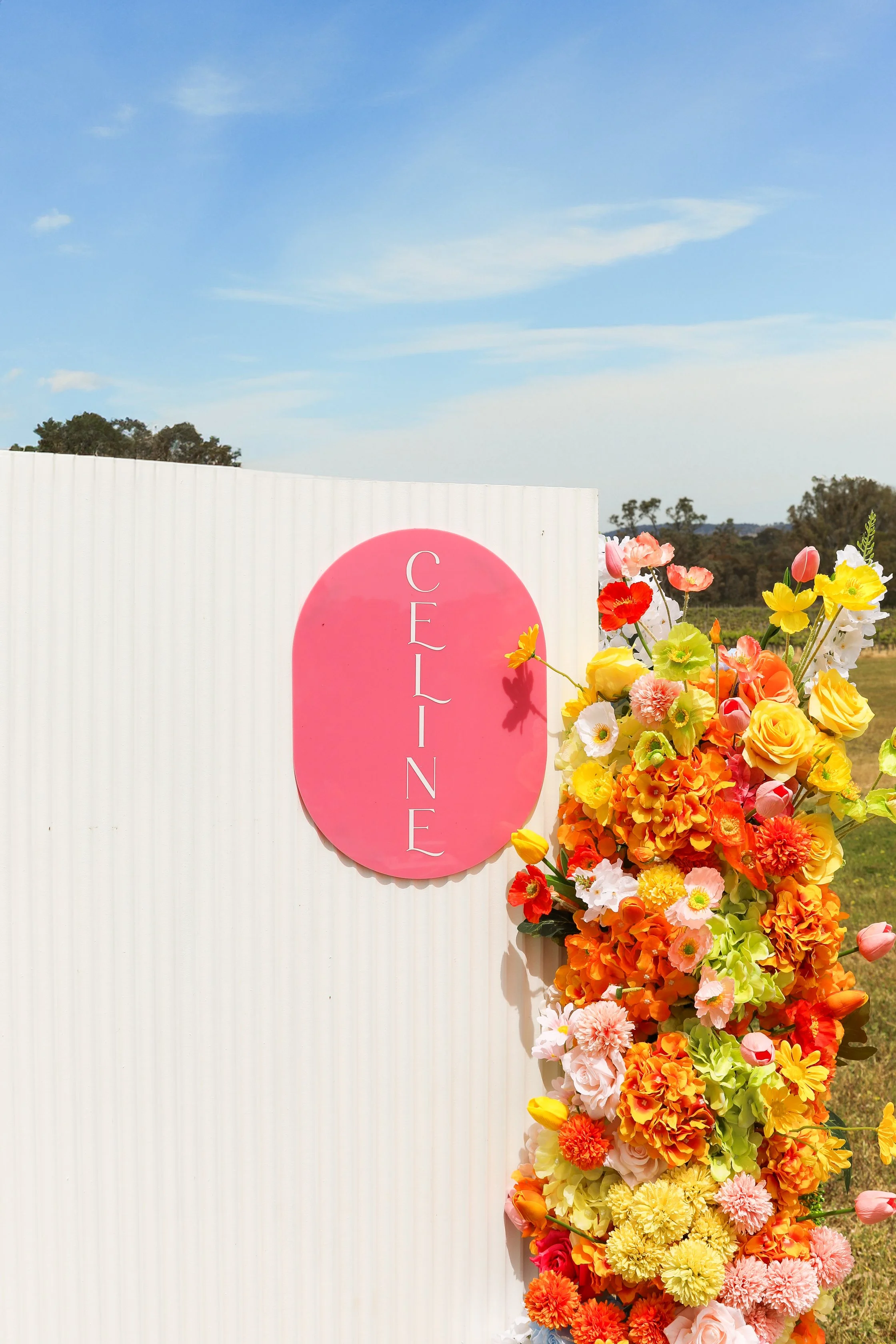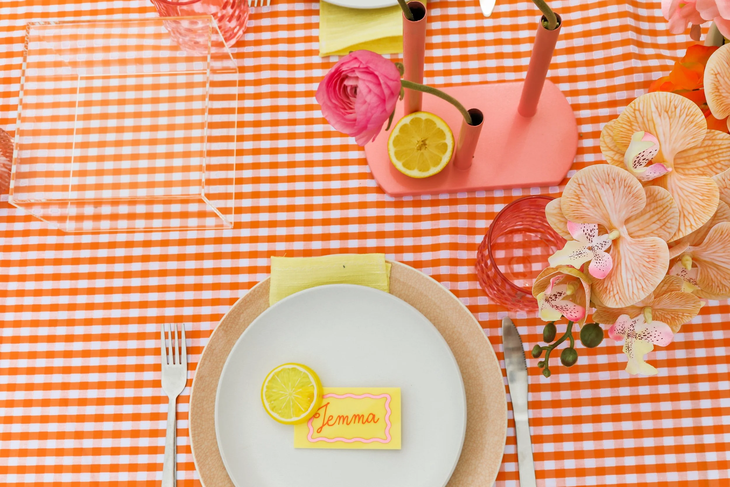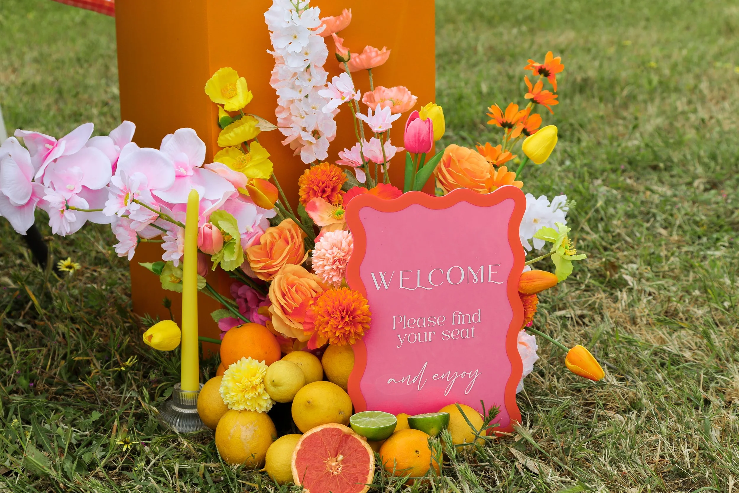 For Celine’s birthday celebration, we curated a vibrant citrus-themed soiree. The colour palette featured shades of pink, orange, yellow, and greens, mirroring the hues found in citrus fruits. We styled the tables with patterned gingham tablecloths and bright floral arrangements bursting with poppies and tulips.
