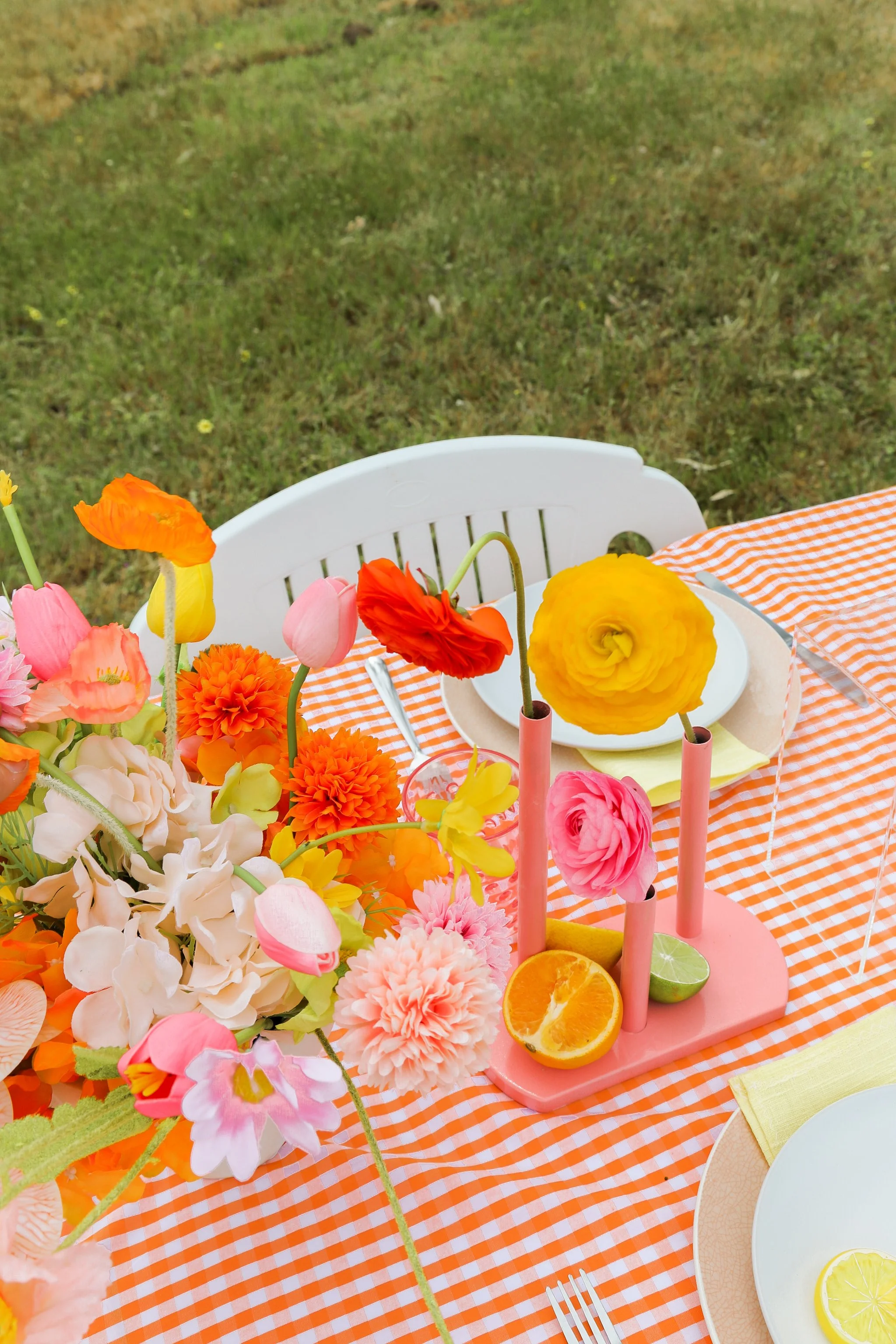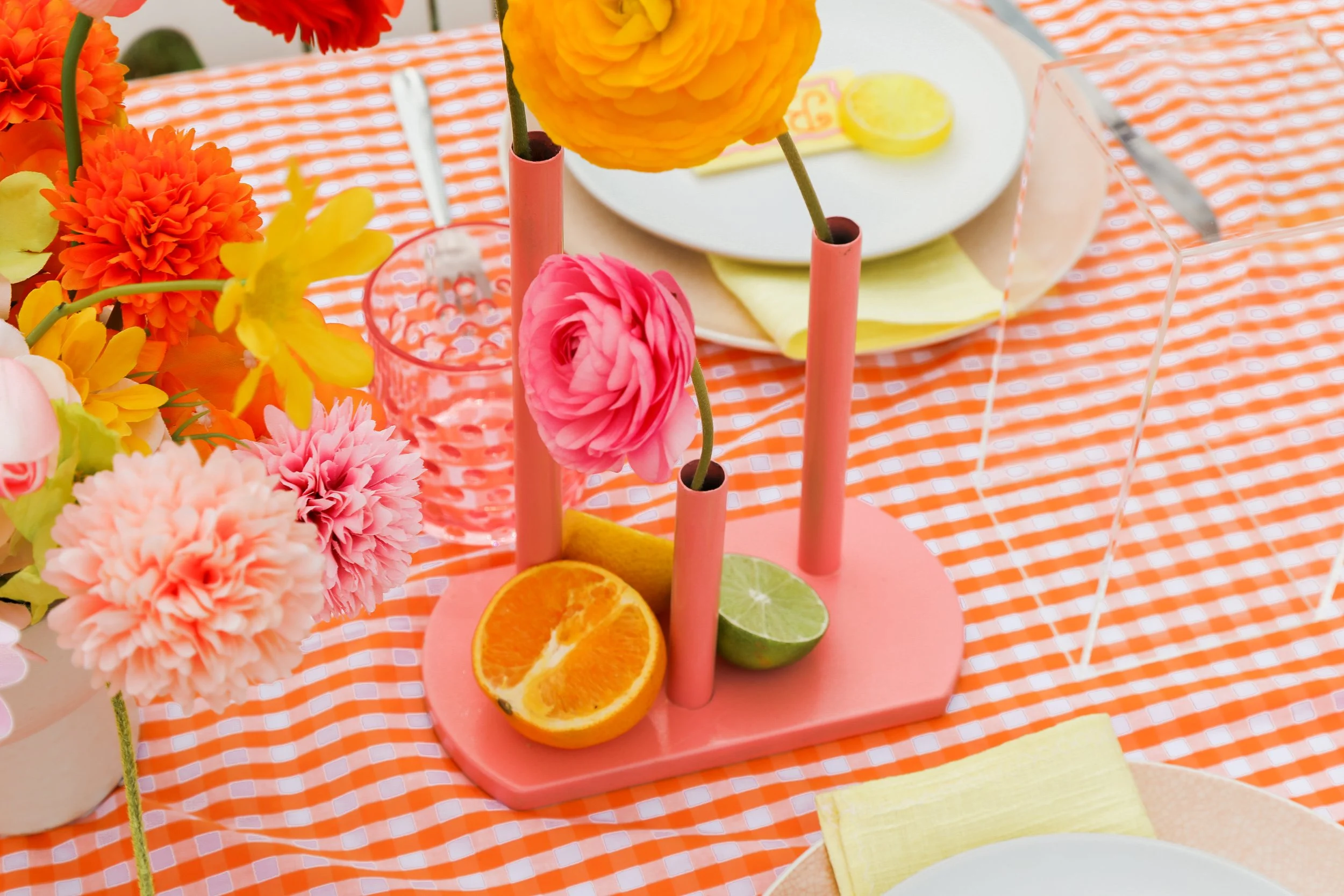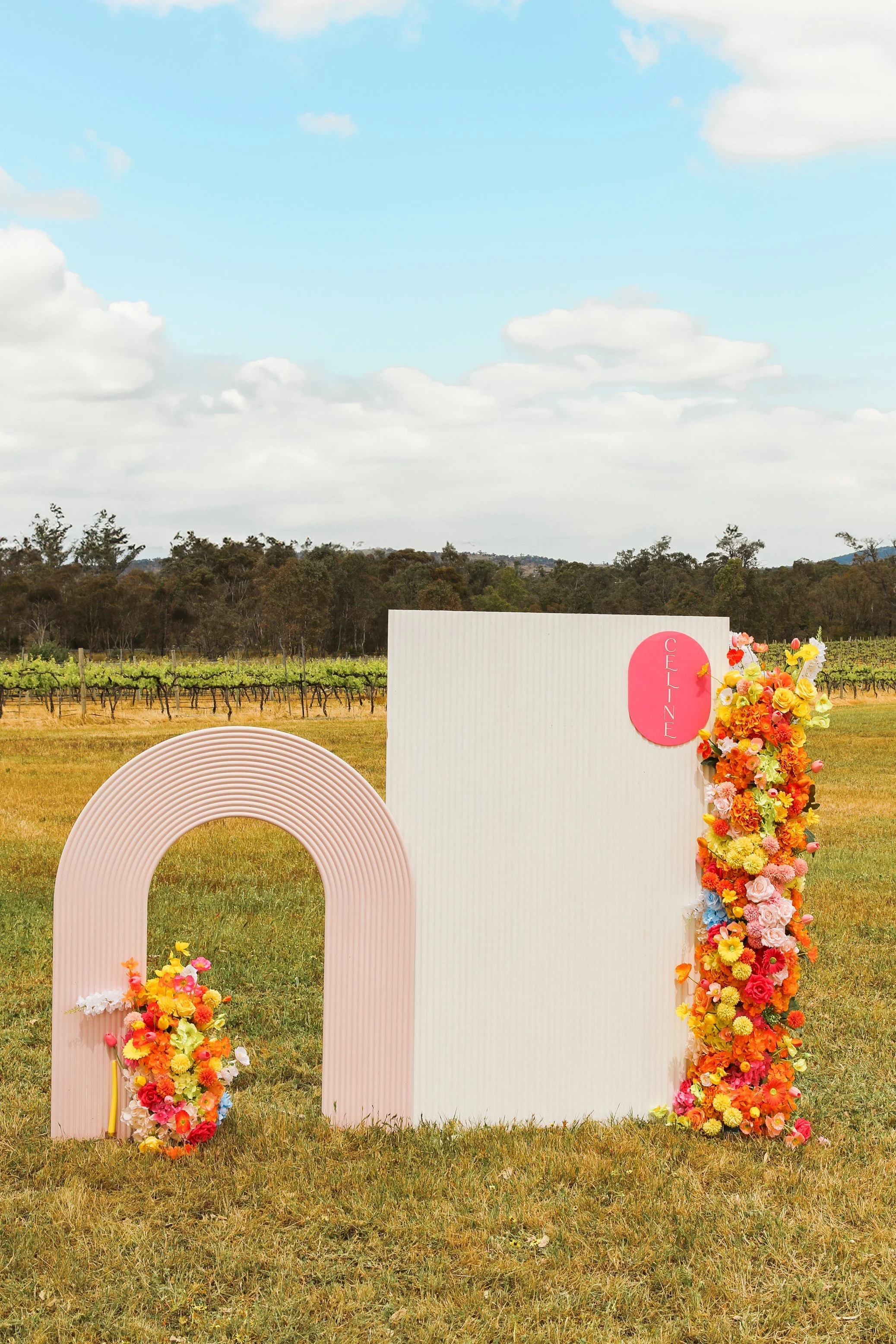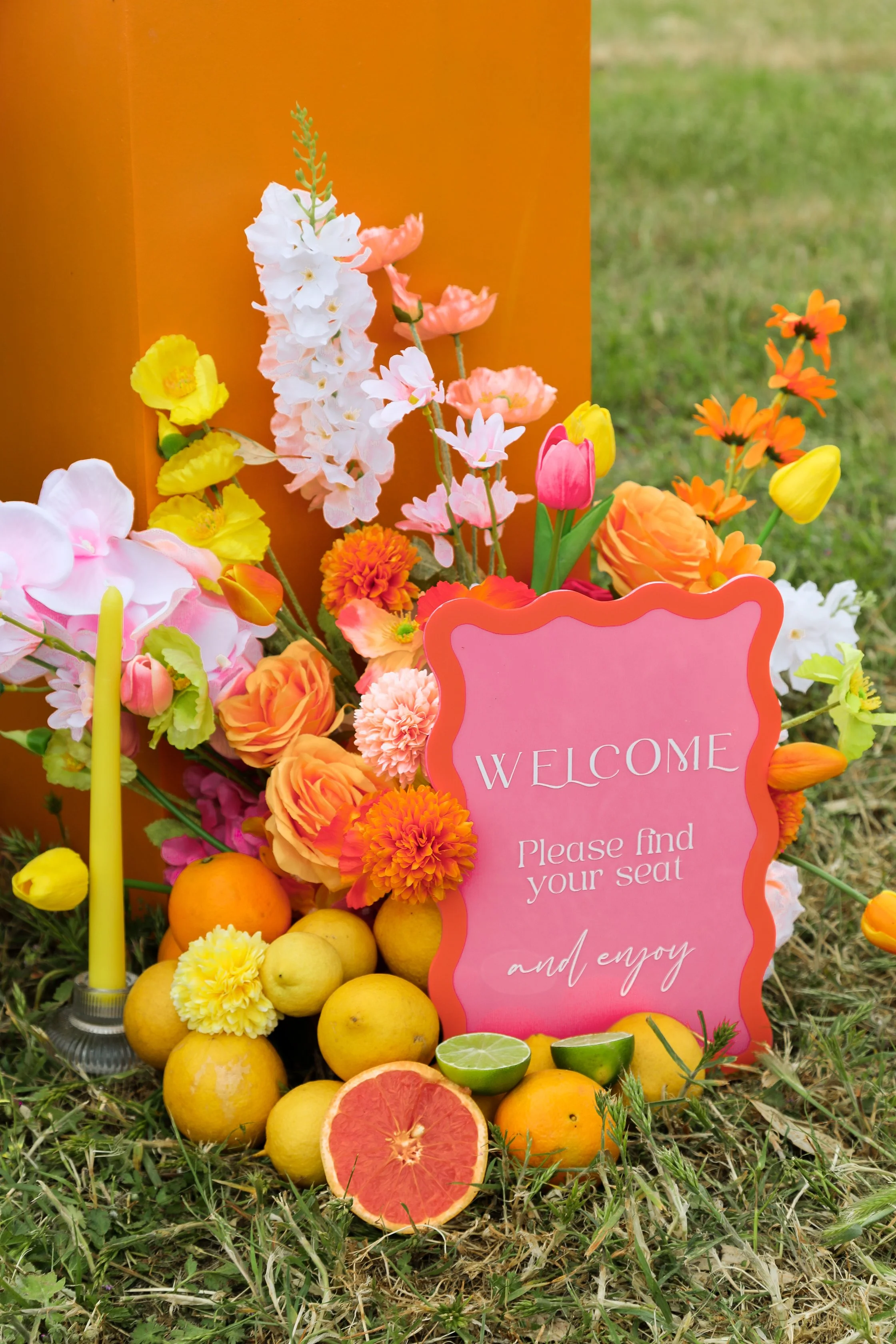 For Celine’s birthday celebration, we curated a vibrant citrus-themed soiree. The colour palette featured shades of pink, orange, yellow, and greens, mirroring the hues found in citrus fruits. We styled the tables with patterned gingham tablecloths and bright floral arrangements bursting with poppies and tulips.