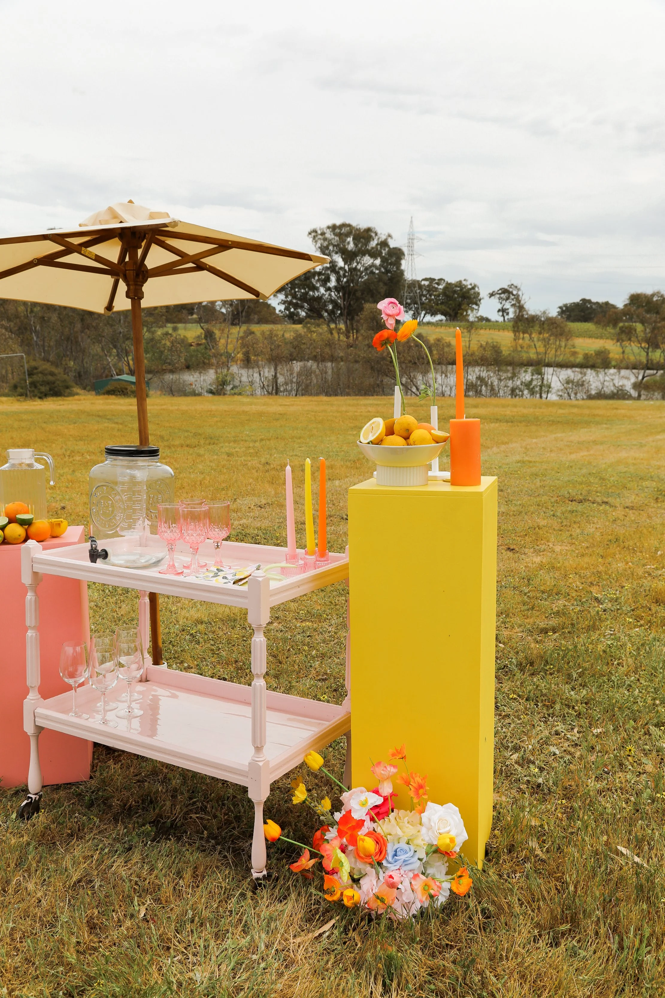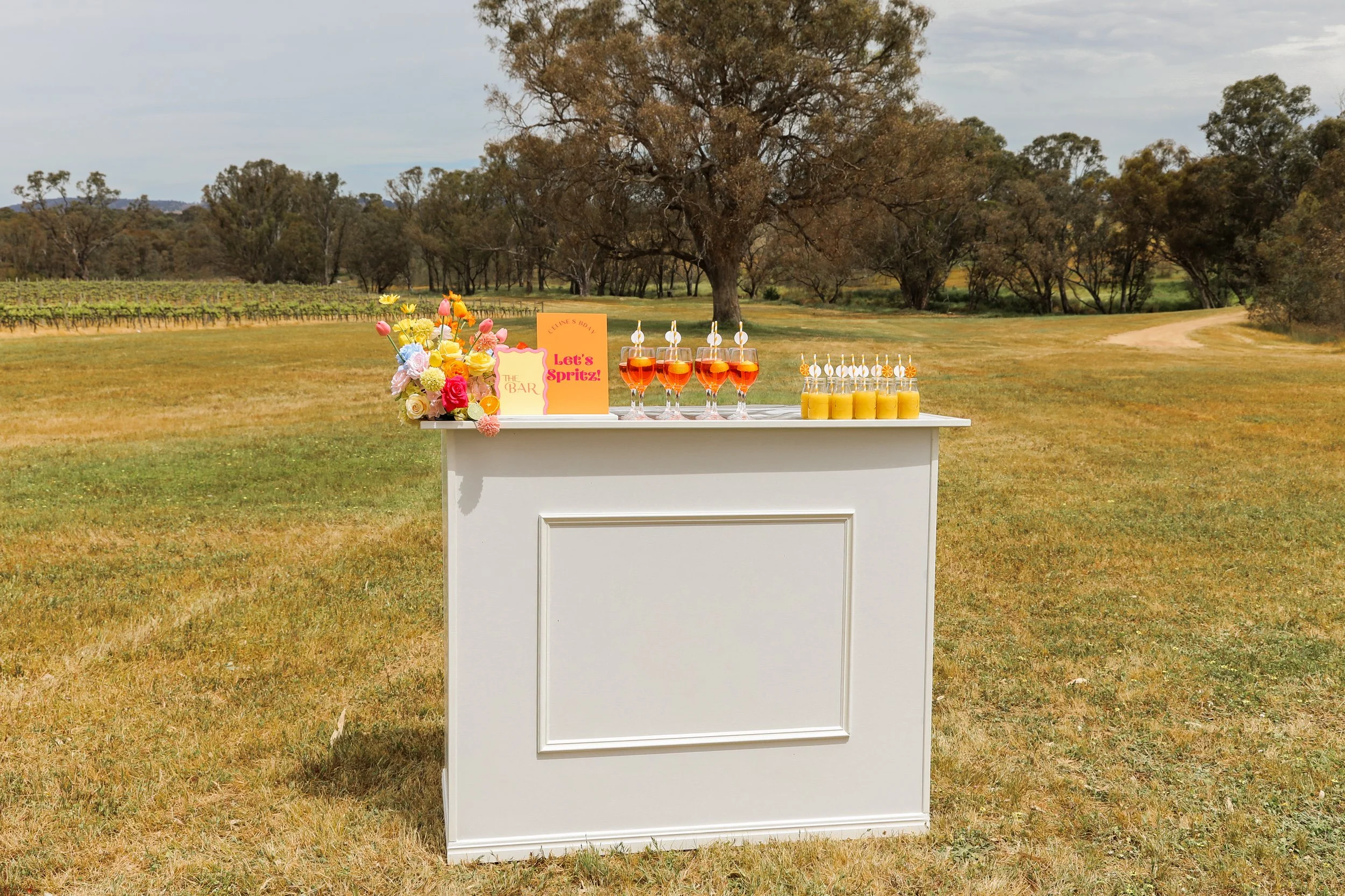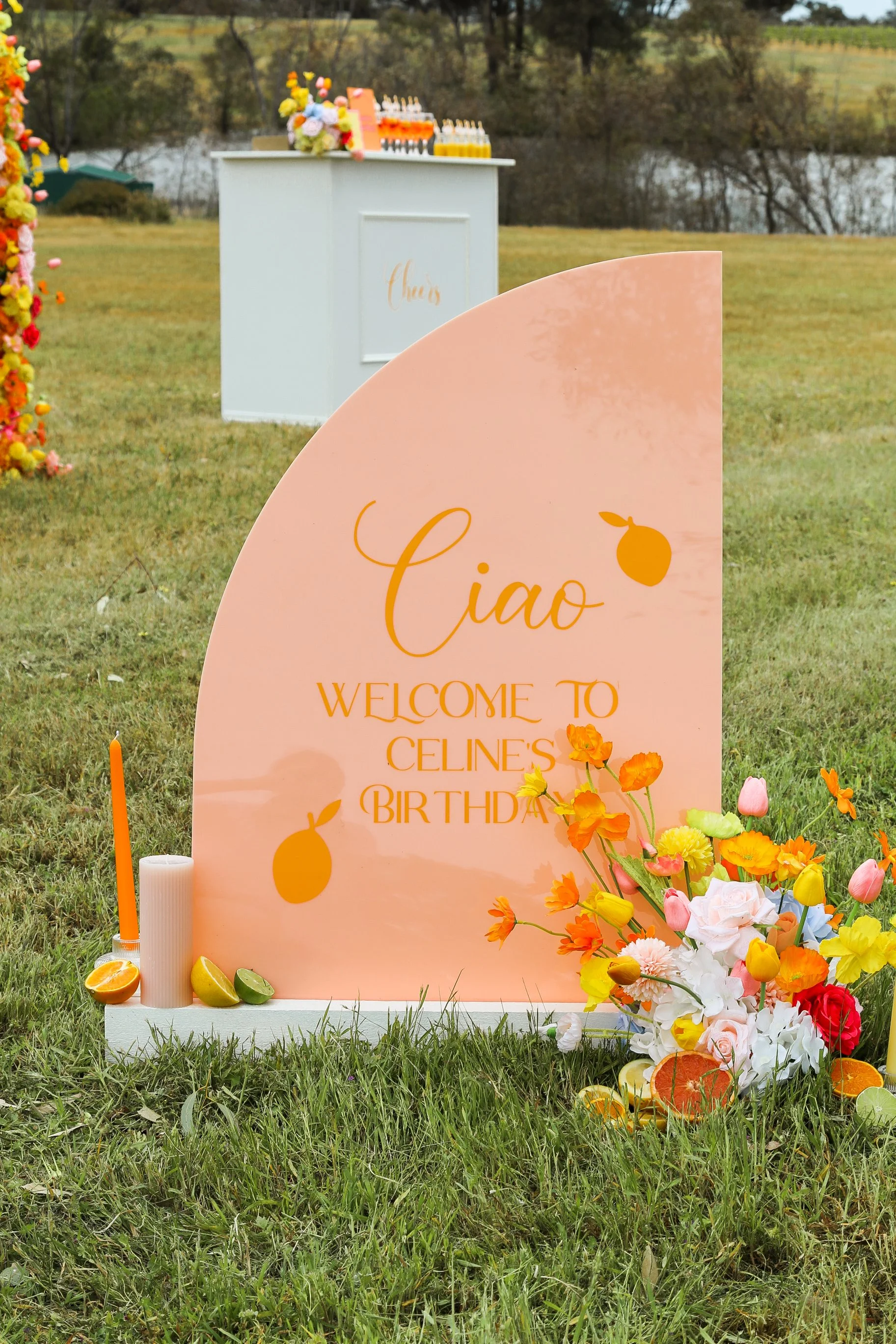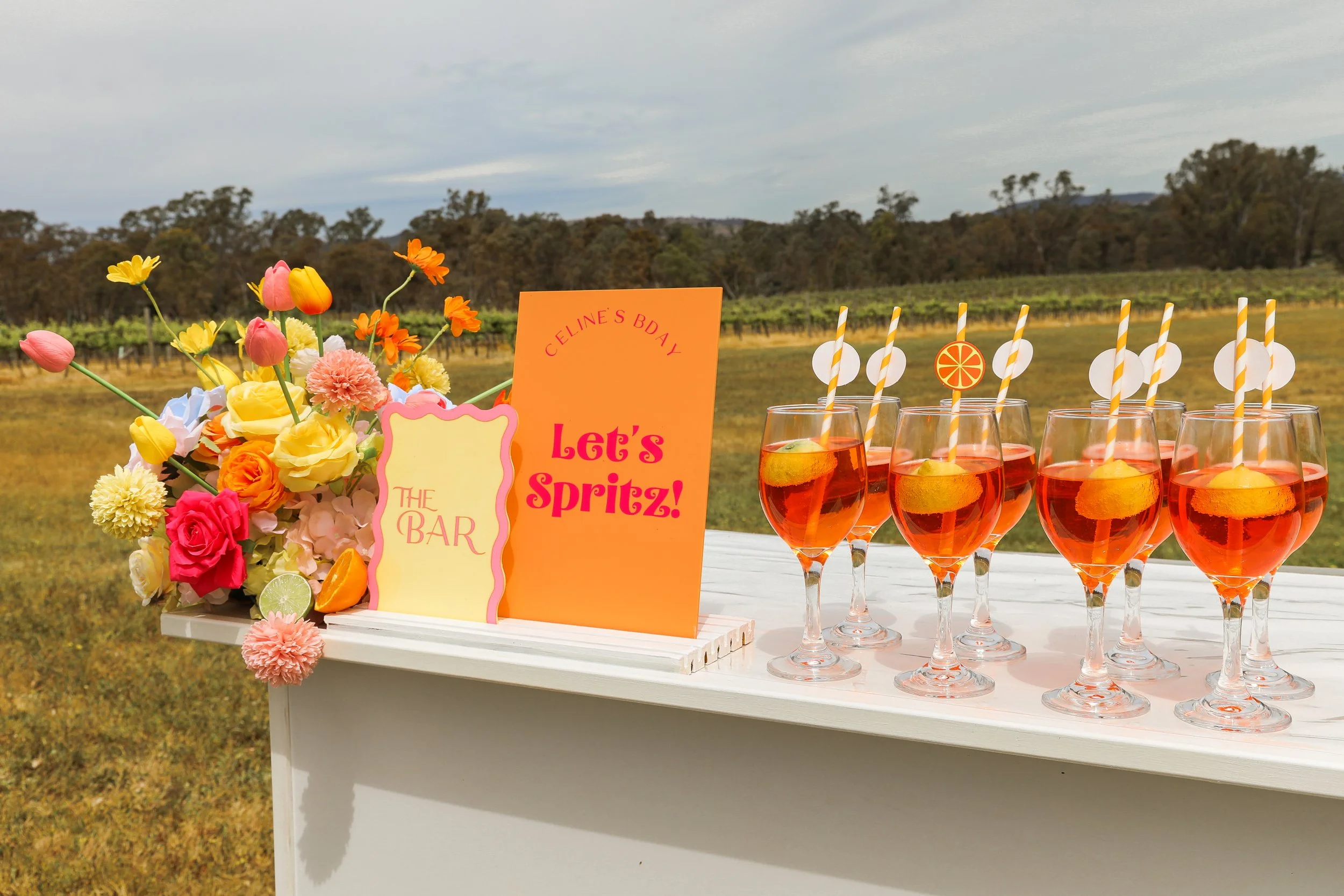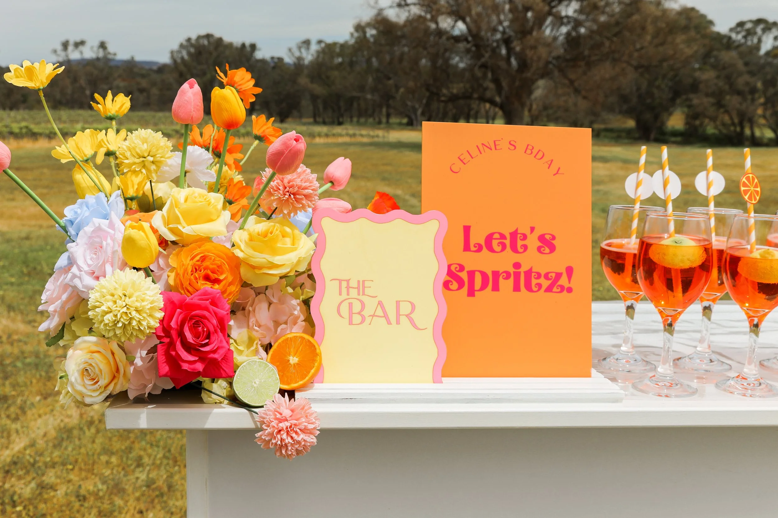 The centre piece of the setup was the citrus tablescape, elegantly arranged for Celine and her seven friends. Our tall white bar complemented the theme perfectly, styled with a bar duo sign and bright arrangement that included the iconic Aperol Spritz. Adding a photo feature, we incorporated the Gold Luxe Package, complete with matching citrus-themed floral stands and a welcoming sign to greet her guests.