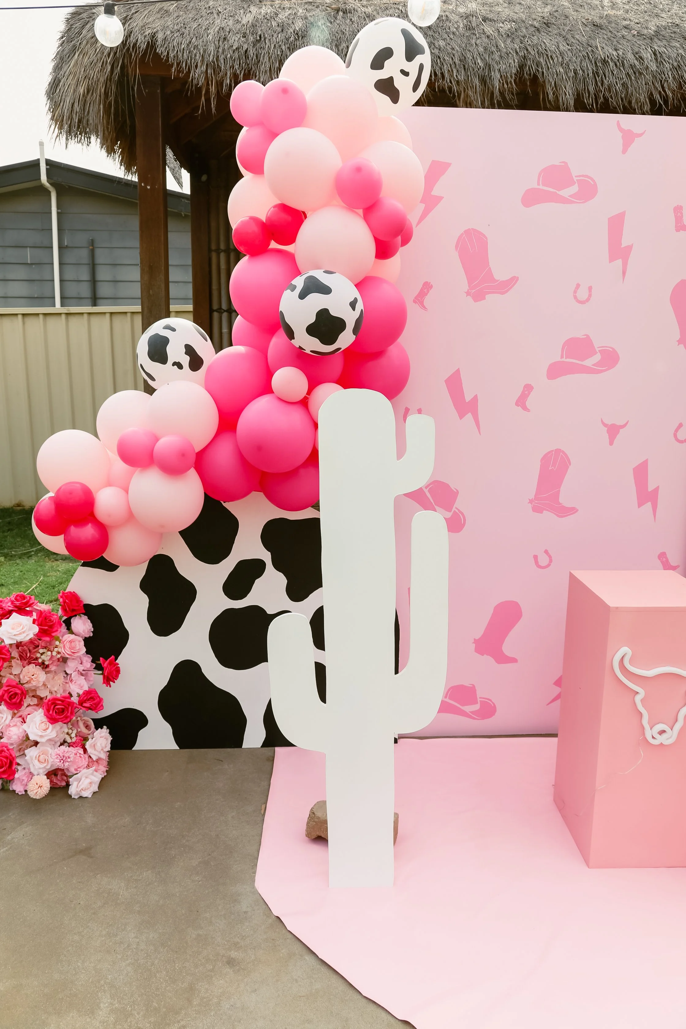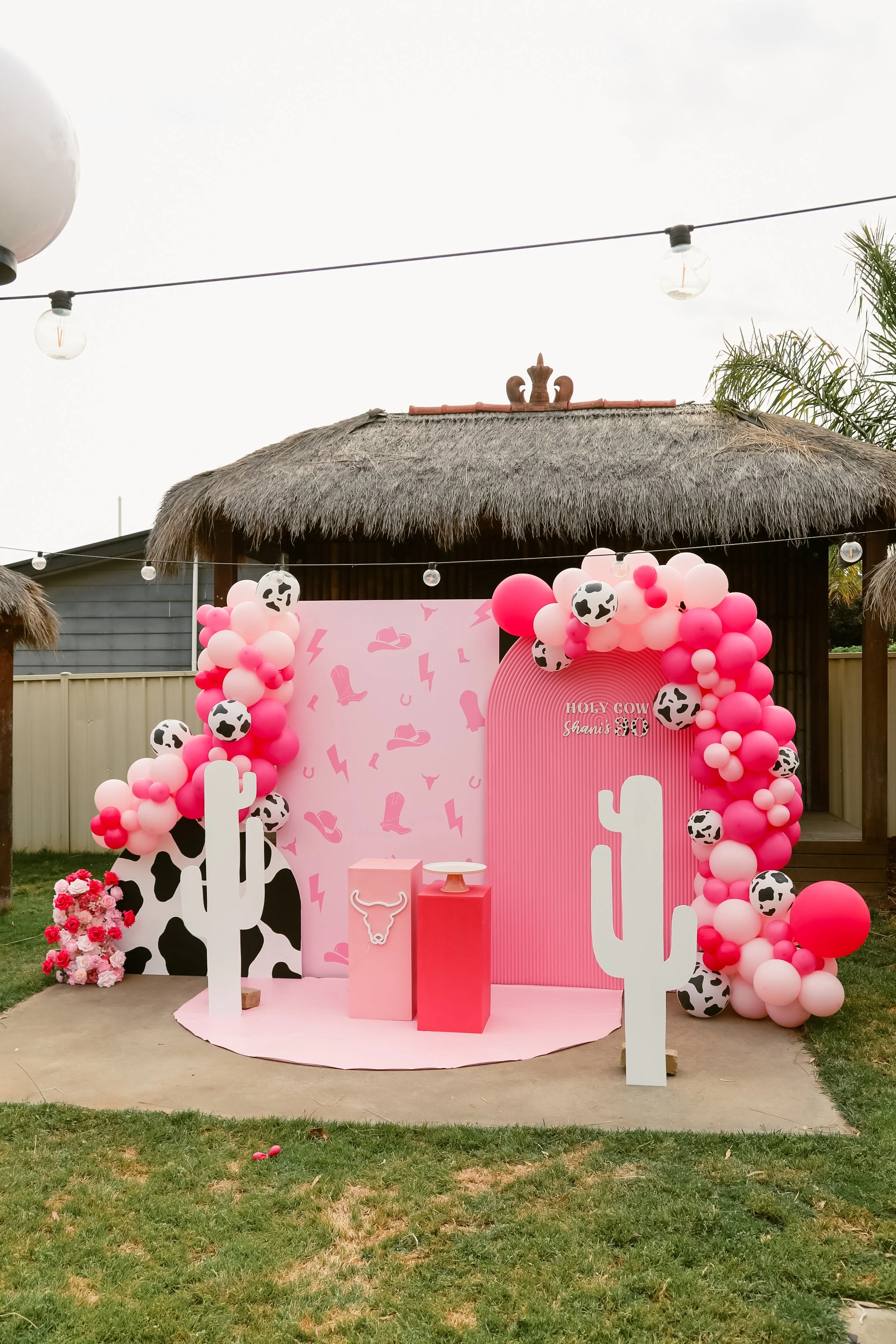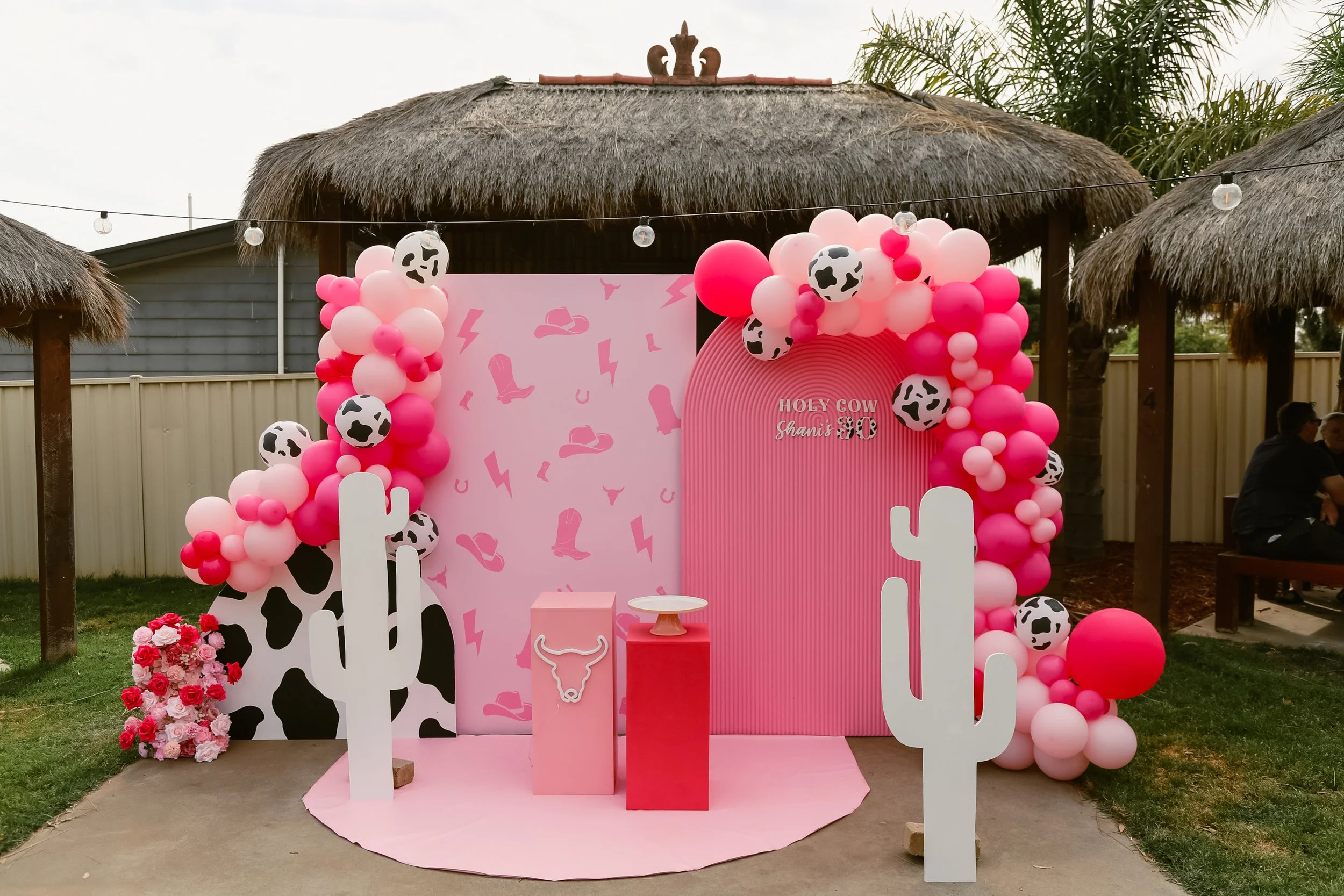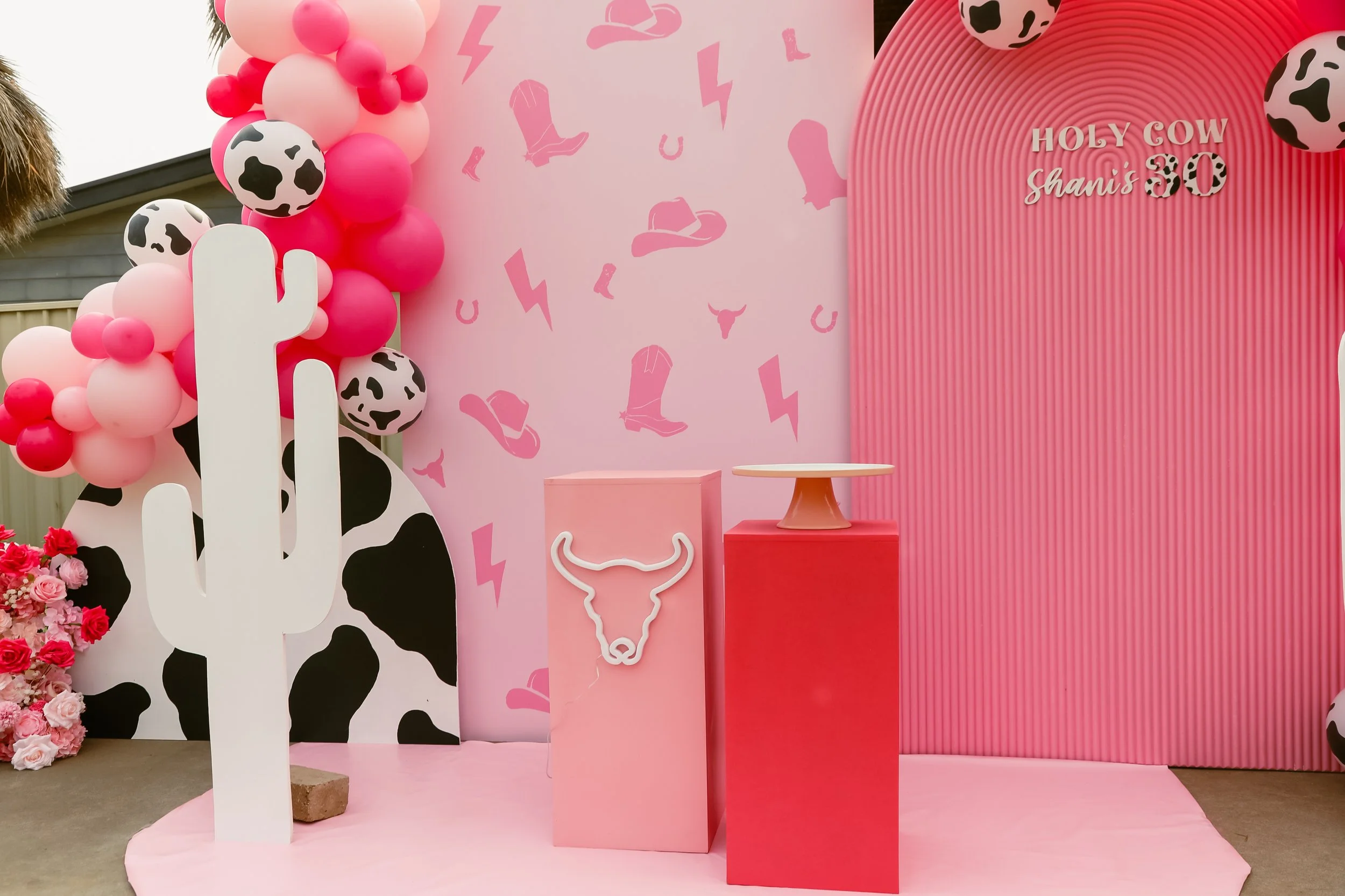 For Shani’s 30th birthday, we pulled out all the stops with a fully customised design that perfectly captured her vision. The theme blended vibrant pink hues with classic Western motifs, resulting in a setup that was both bold and playful. Imagine cow print balloons, alongside custom-built cacti that added an authentic touch to the decor. The centre piece of our design was the striking backdrop featuring lightning bolts, cowgirl boots, and hats, all creatively printed to enhance the Western theme. This backdrop served as the perfect focal point for capturing memorable photos throughout the event.