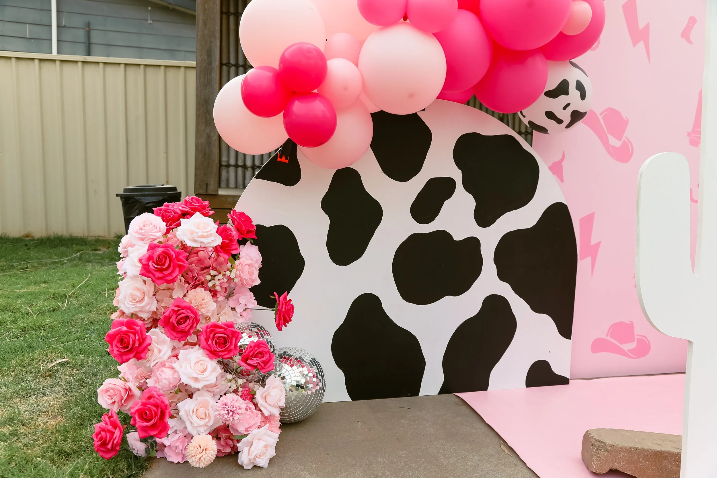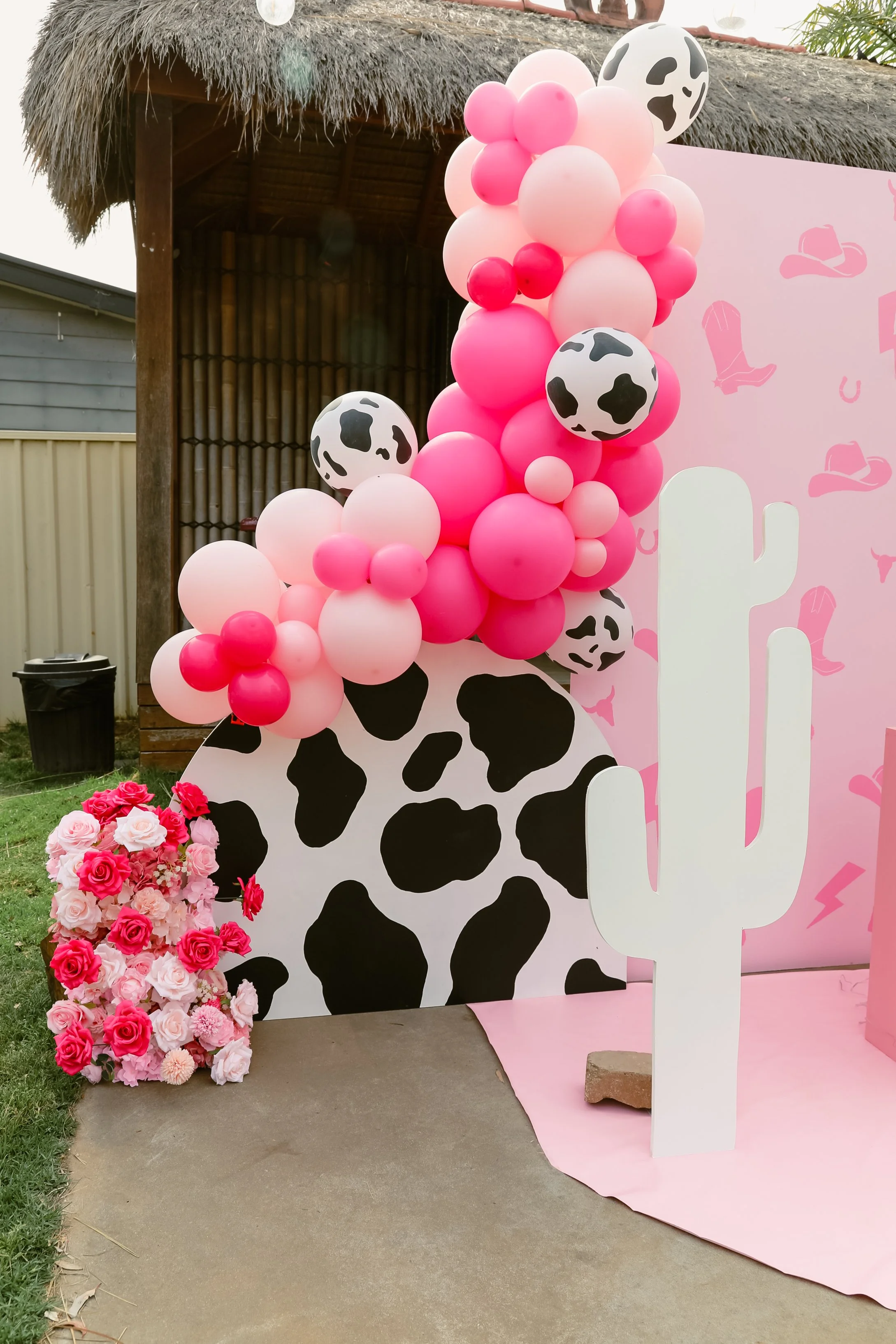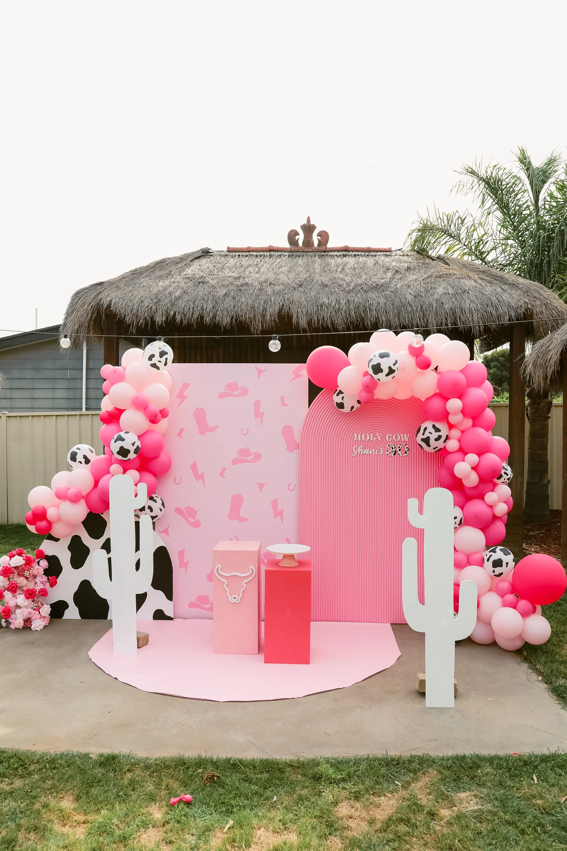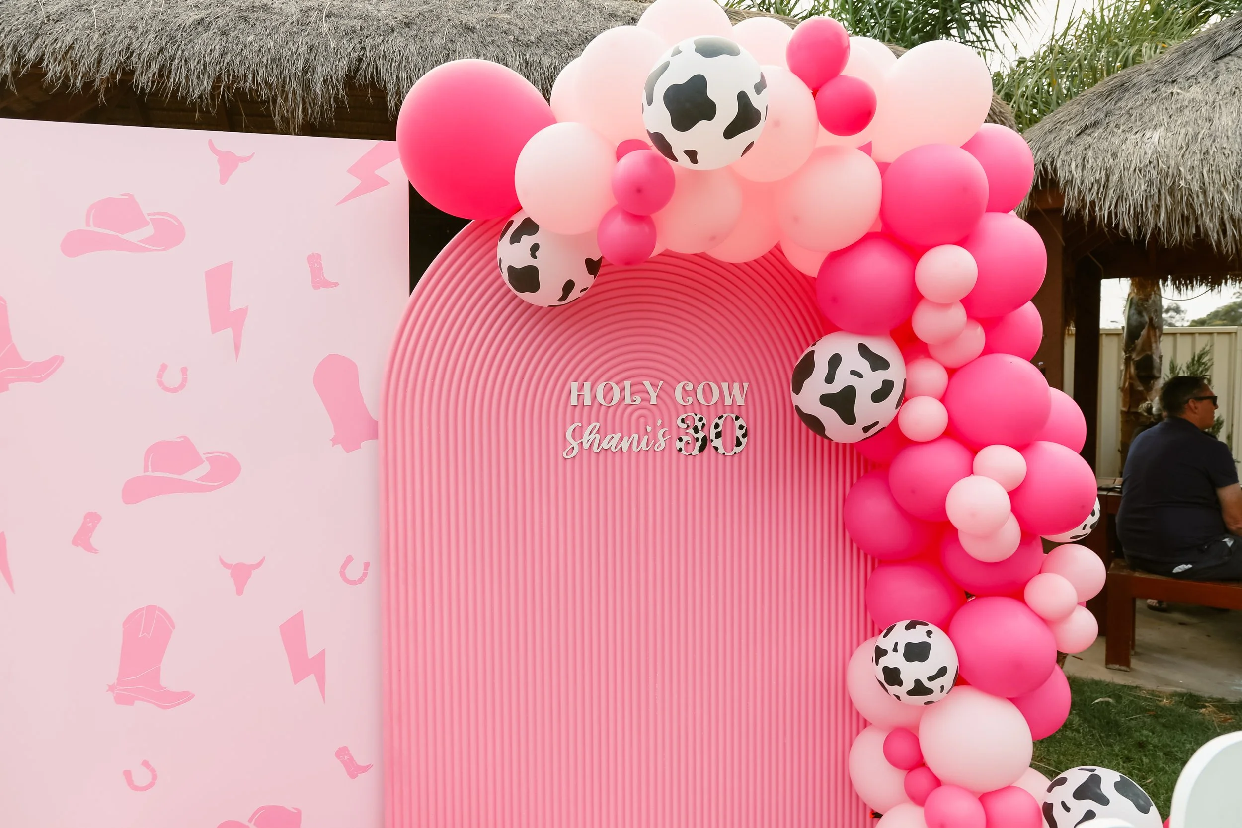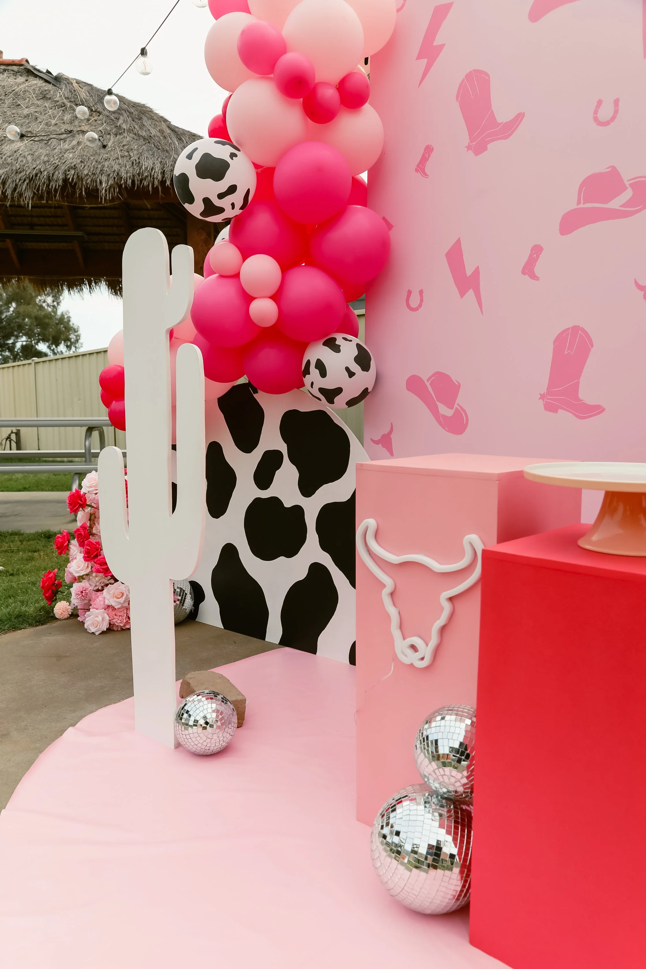 For Shani’s 30th birthday, we pulled out all the stops with a fully customised design that perfectly captured her vision. The theme blended vibrant pink hues with classic Western motifs, resulting in a setup that was both bold and playful. Imagine cow print balloons, alongside custom-built cacti that added an authentic touch to the decor. The centre piece of our design was the striking backdrop featuring lightning bolts, cowgirl boots, and hats, all creatively printed to enhance the Western theme. This backdrop served as the perfect focal point for capturing memorable photos throughout the event.