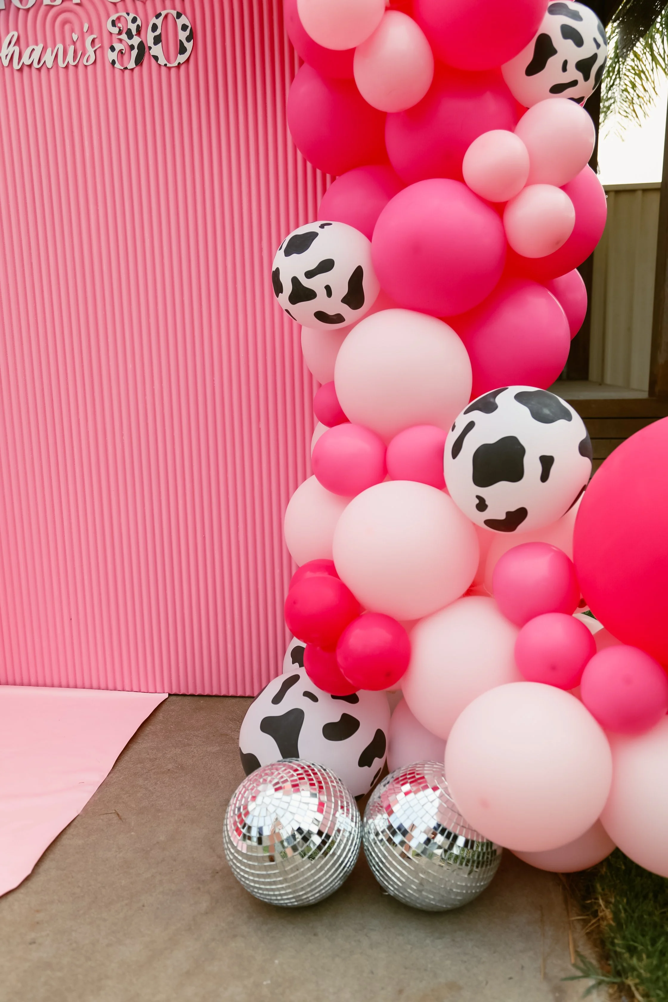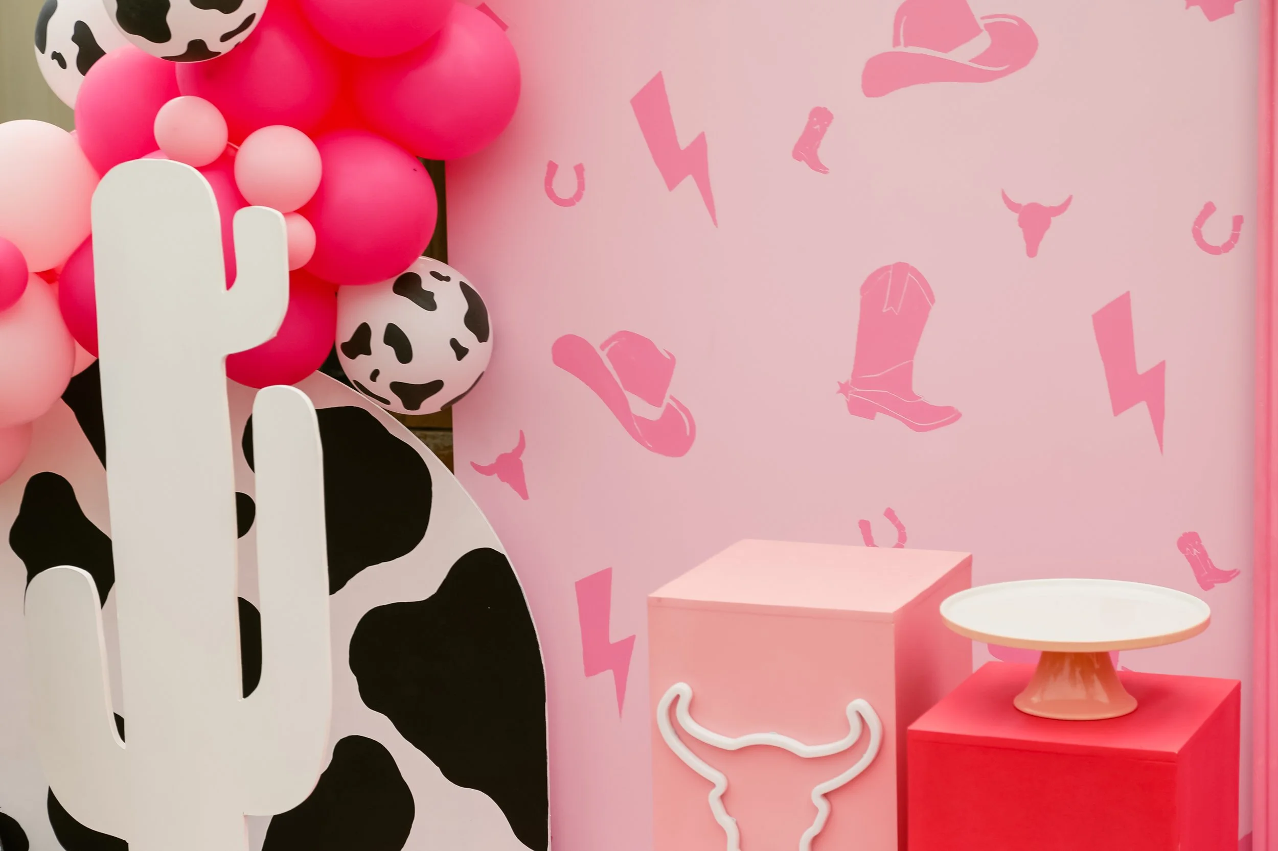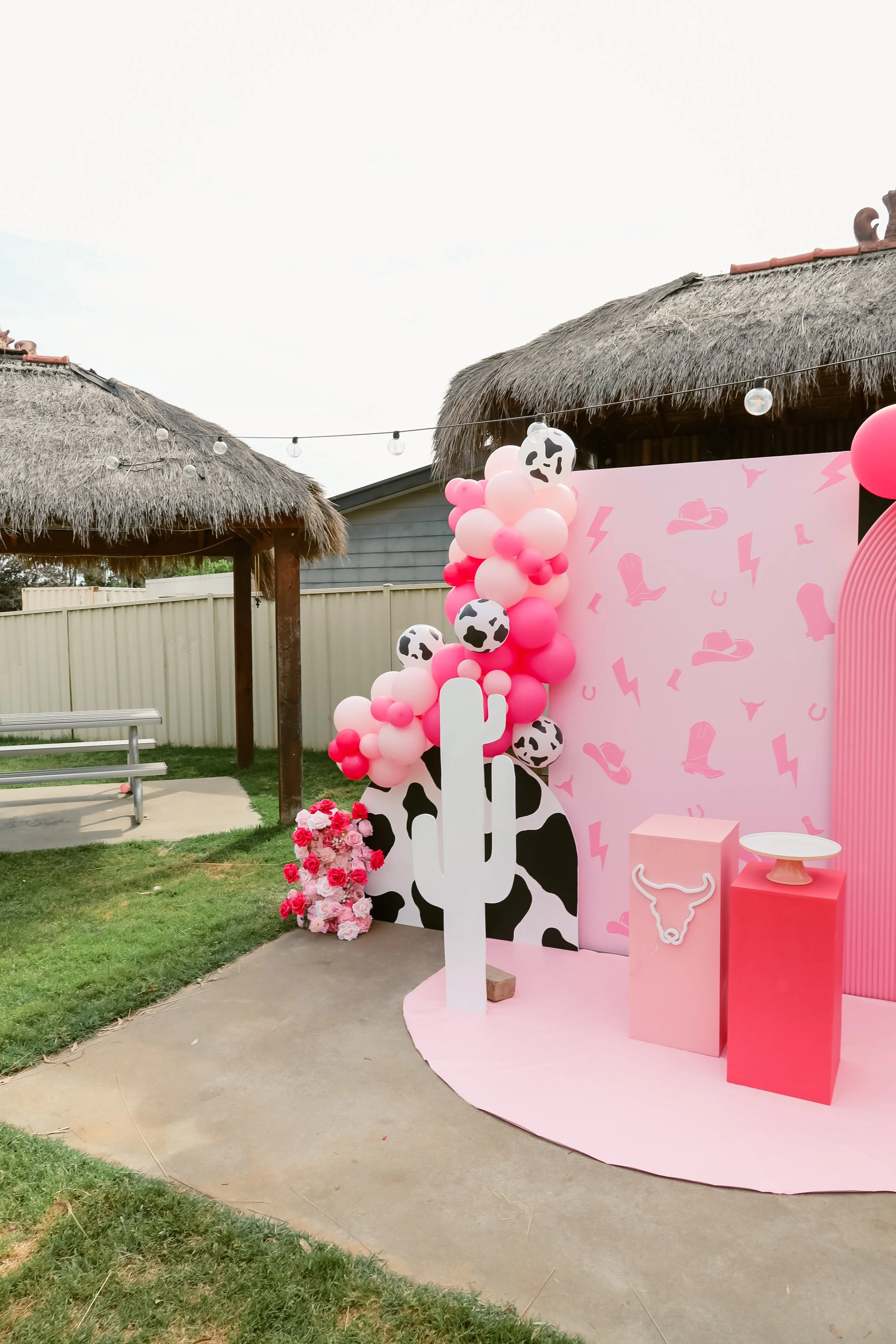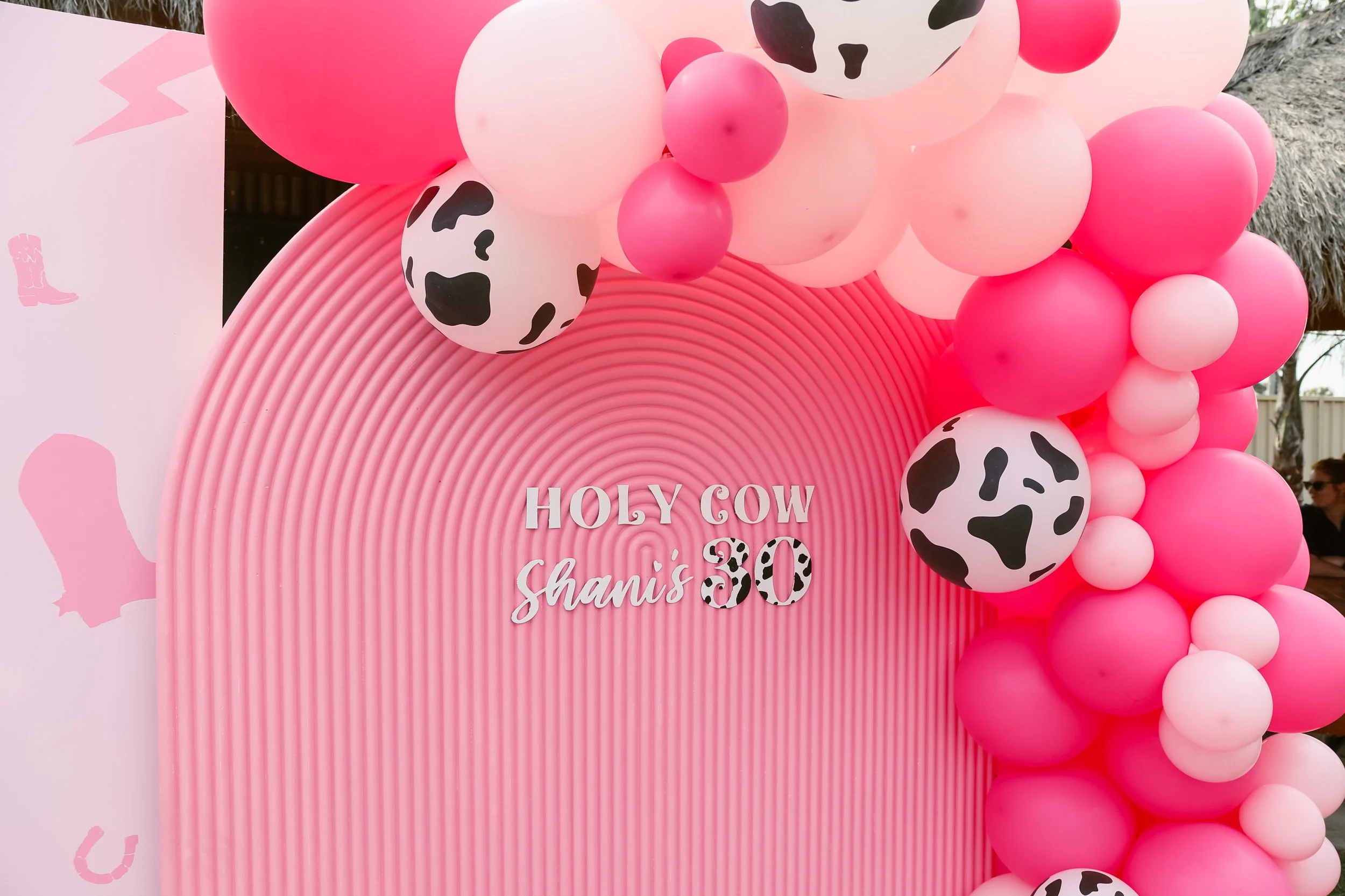 For Shani’s 30th birthday, we pulled out all the stops with a fully customised design that perfectly captured her vision. The theme blended vibrant pink hues with classic Western motifs, resulting in a setup that was both bold and playful. Imagine cow print balloons, alongside custom-built cacti that added an authentic touch to the decor. The centre piece of our design was the striking backdrop featuring lightning bolts, cowgirl boots, and hats, all creatively printed to enhance the Western theme. This backdrop served as the perfect focal point for capturing memorable photos throughout the event.