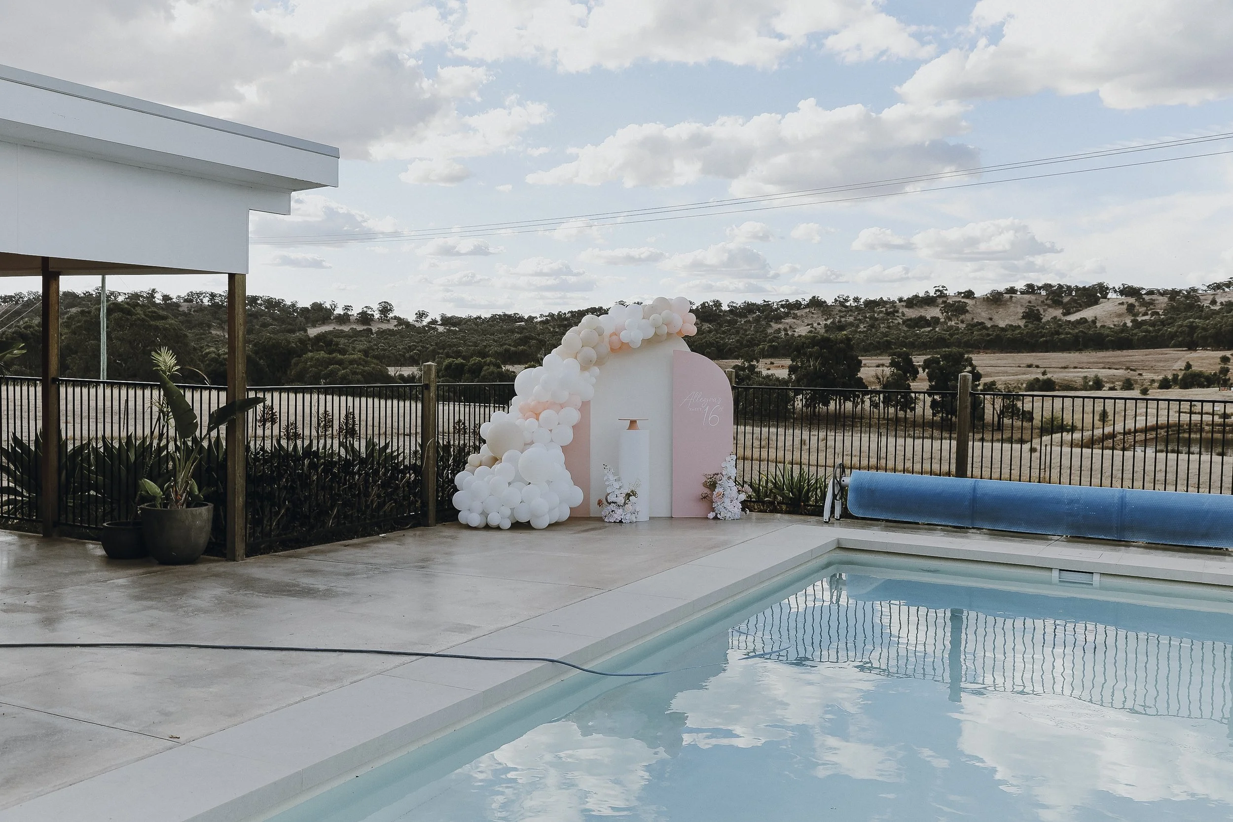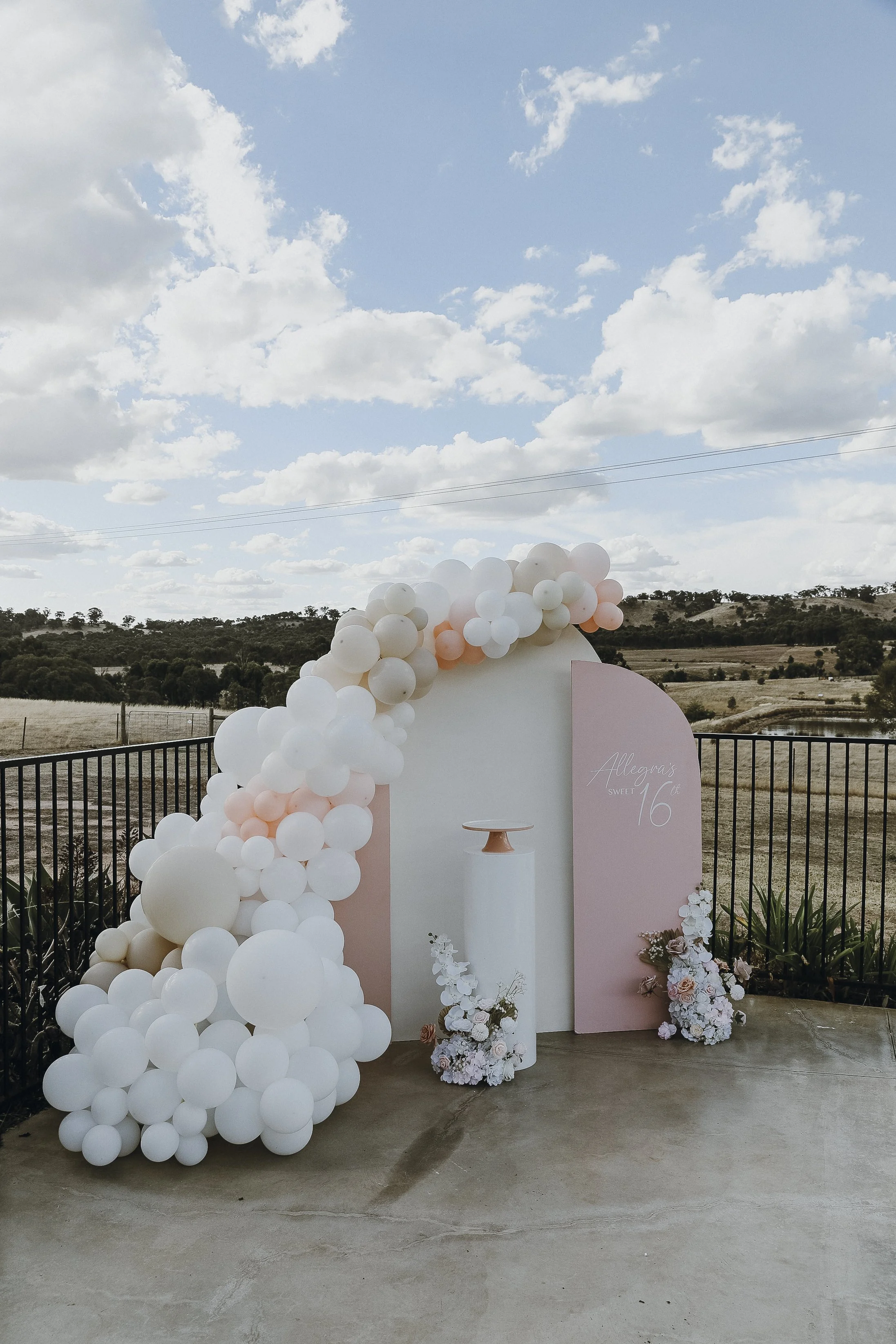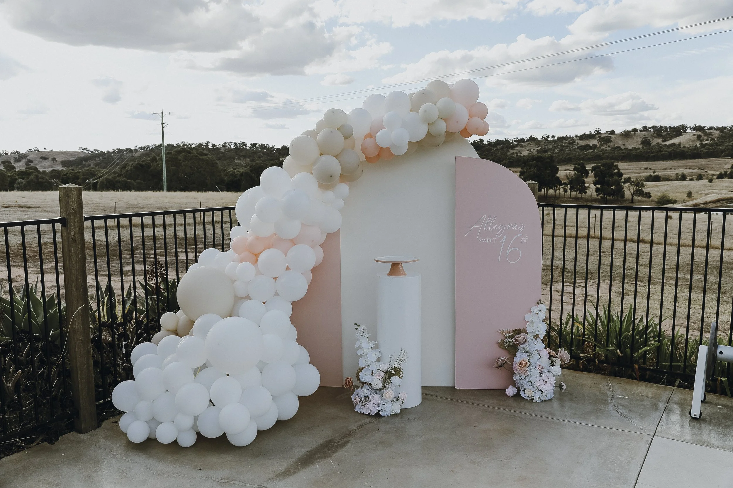 Allegra’s 16th birthday was celebrated at her beautiful property in the mountains of Ravenswood. We opted for a soft pink and neutral colour scheme, using our Pink Arch Trio as the main backdrop. This was complemented by a 4 meter balloon garland and a large ground cluster, creating a stunning focal point. Boho pink floral arrangements added a touch of elegance, while our cake stand & personalised signage attached completed the look.