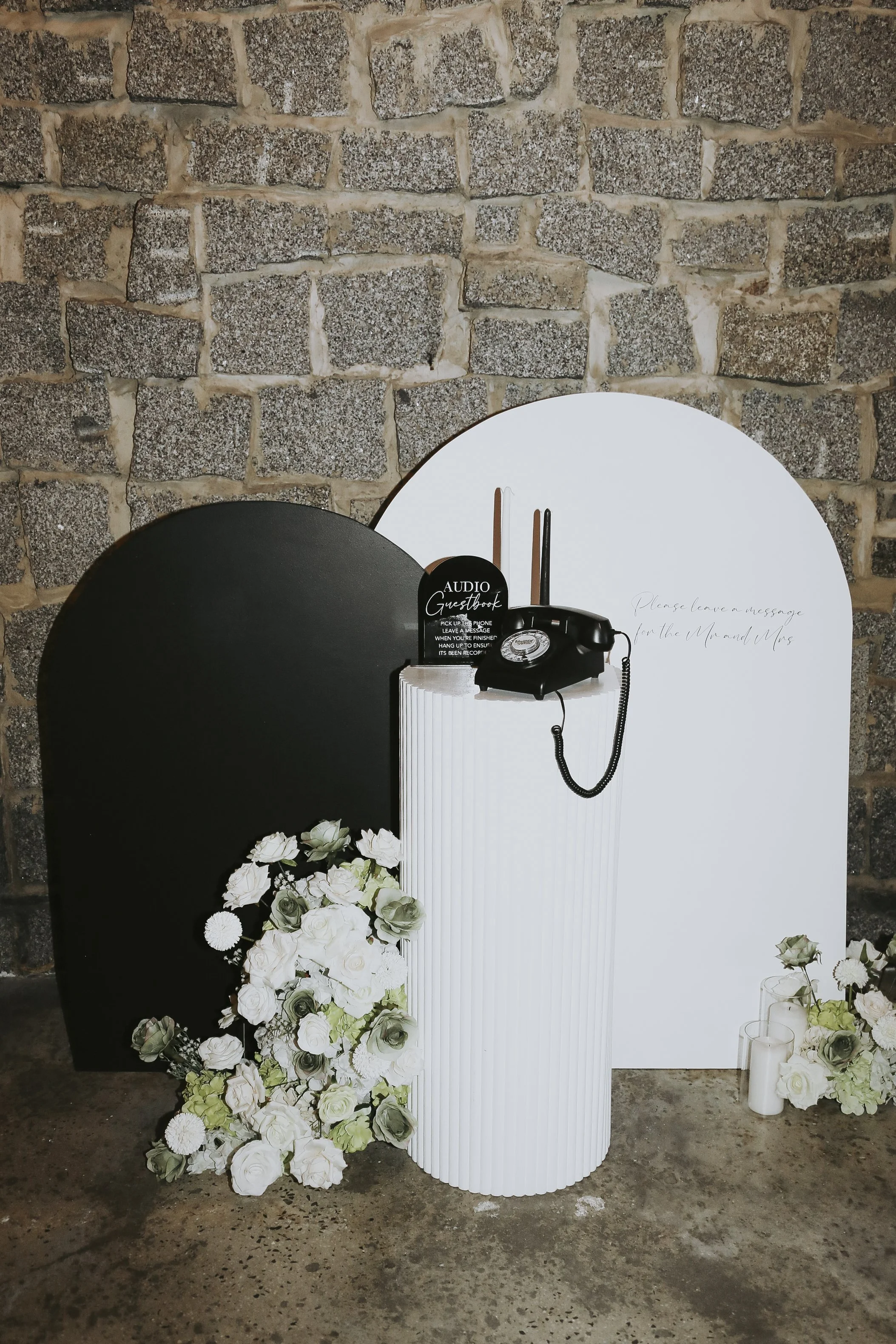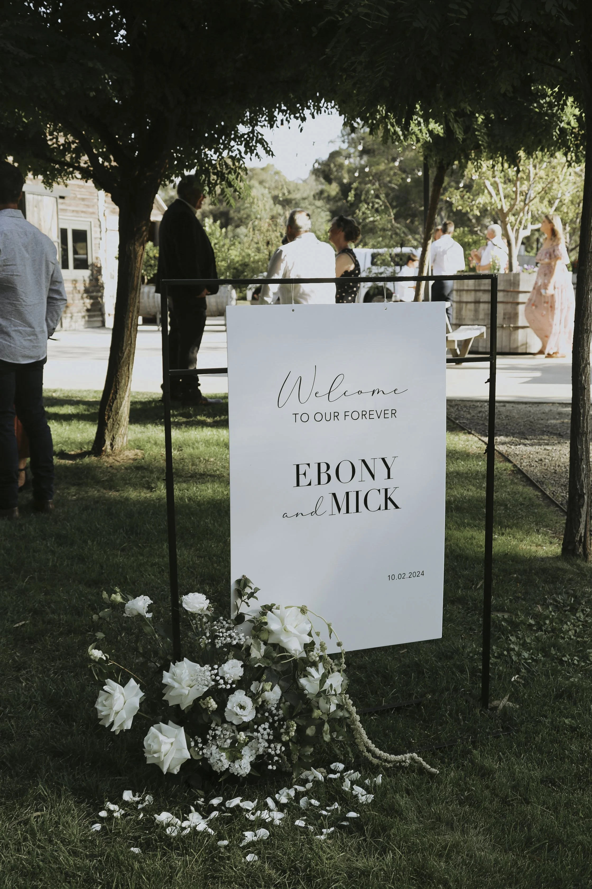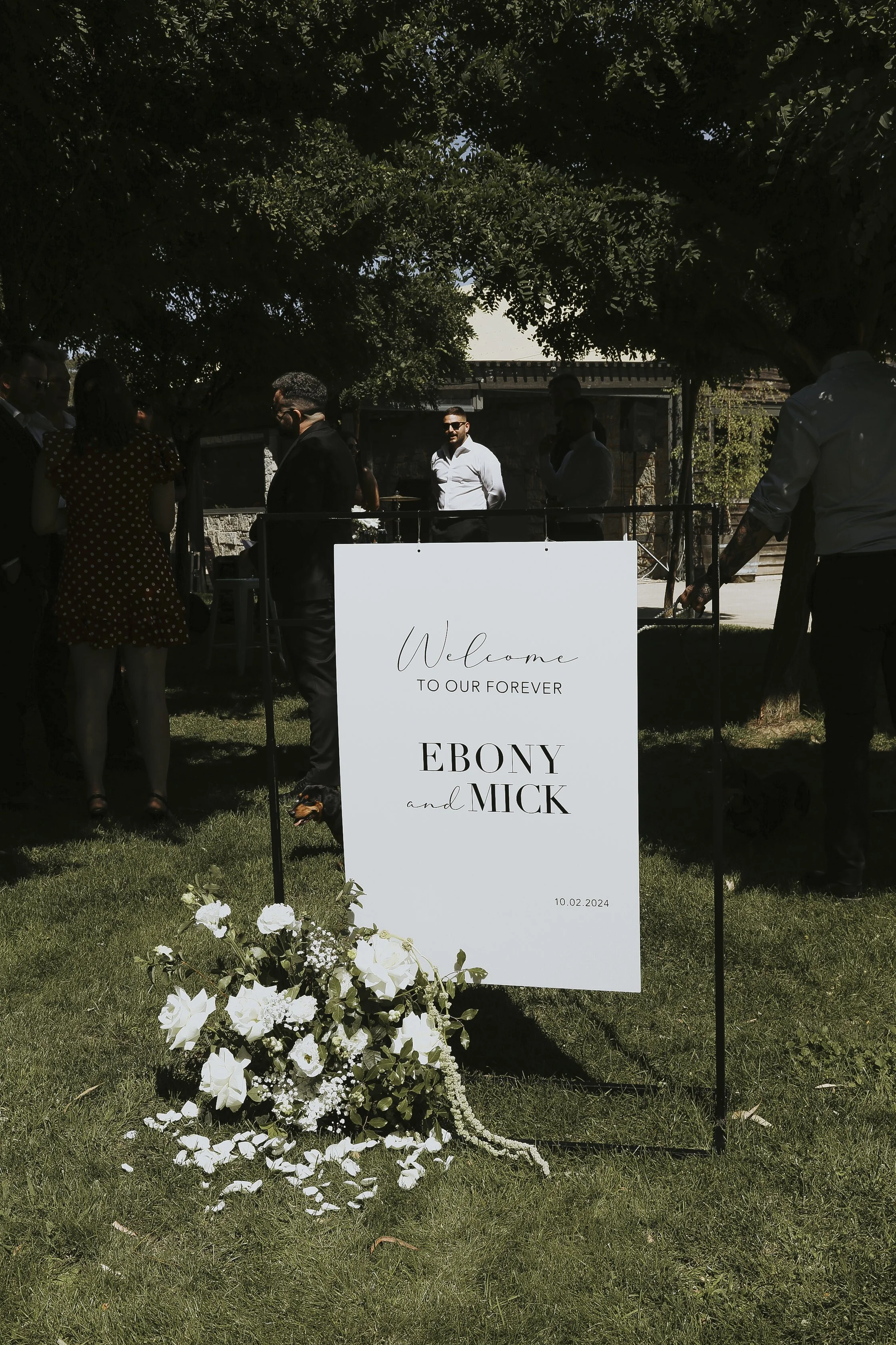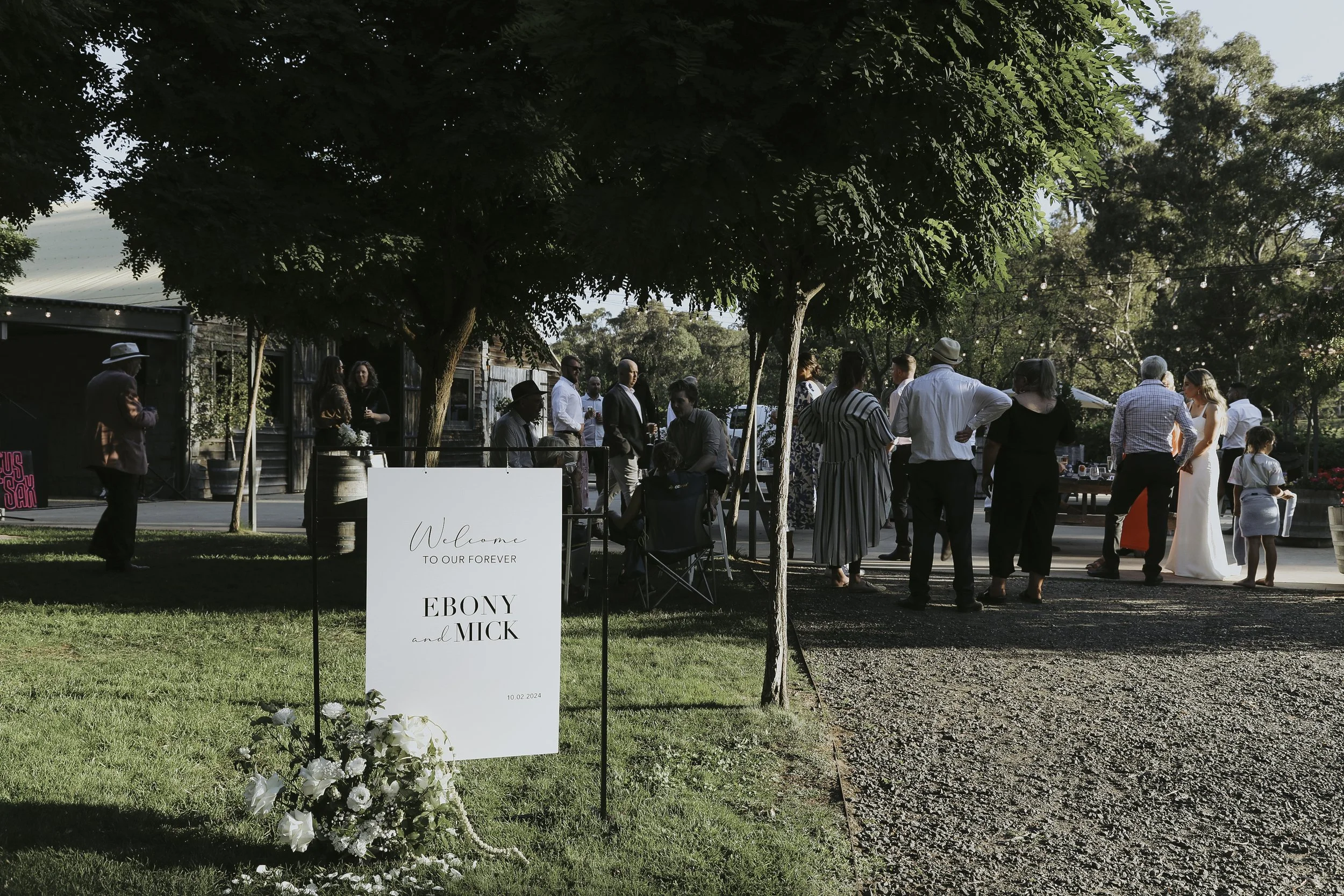 Ebony & MickEb and Mick celebrated their wedding day amidst the picturesque surroundings of Harcourt Valley Winery. It was a joy to capture every moment of their day as their photographer, ensuring their memories were beautifully captured. The hire items really complemented the venues colours and textures, we opted for an Audio Guestbook Arch Duo to hold their phone which blending seamlessly in the space. We also provided a welcome sign, stand, bar sign, and wishing well, all designed to enhance the monochrome style with a touch of green to their special day.