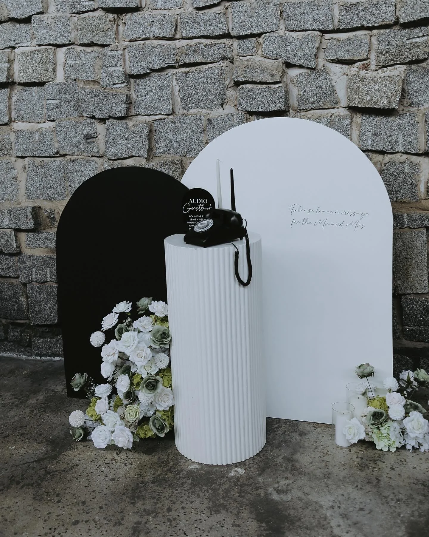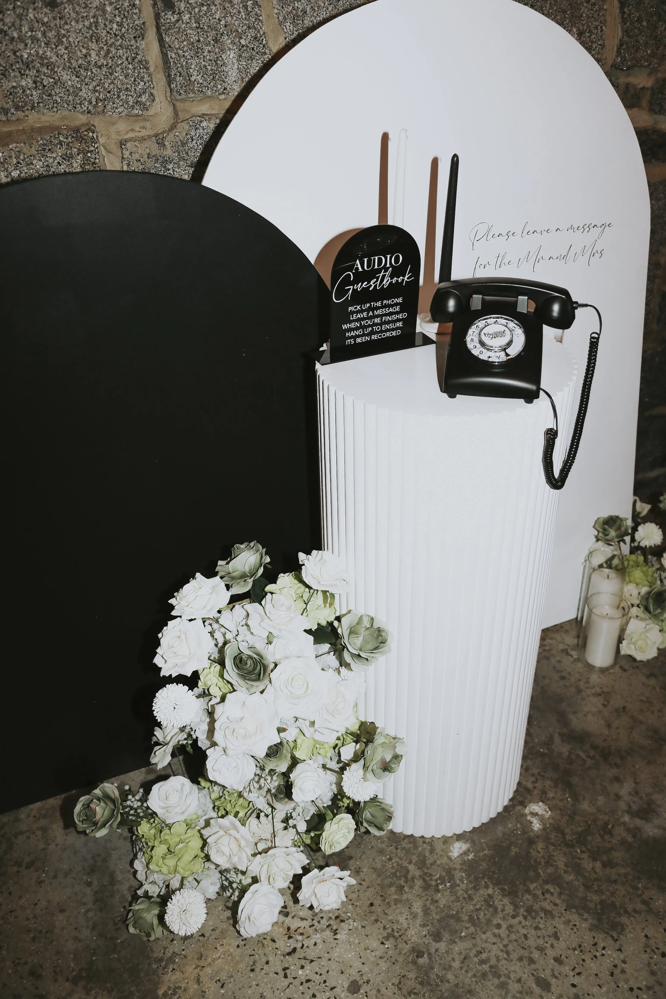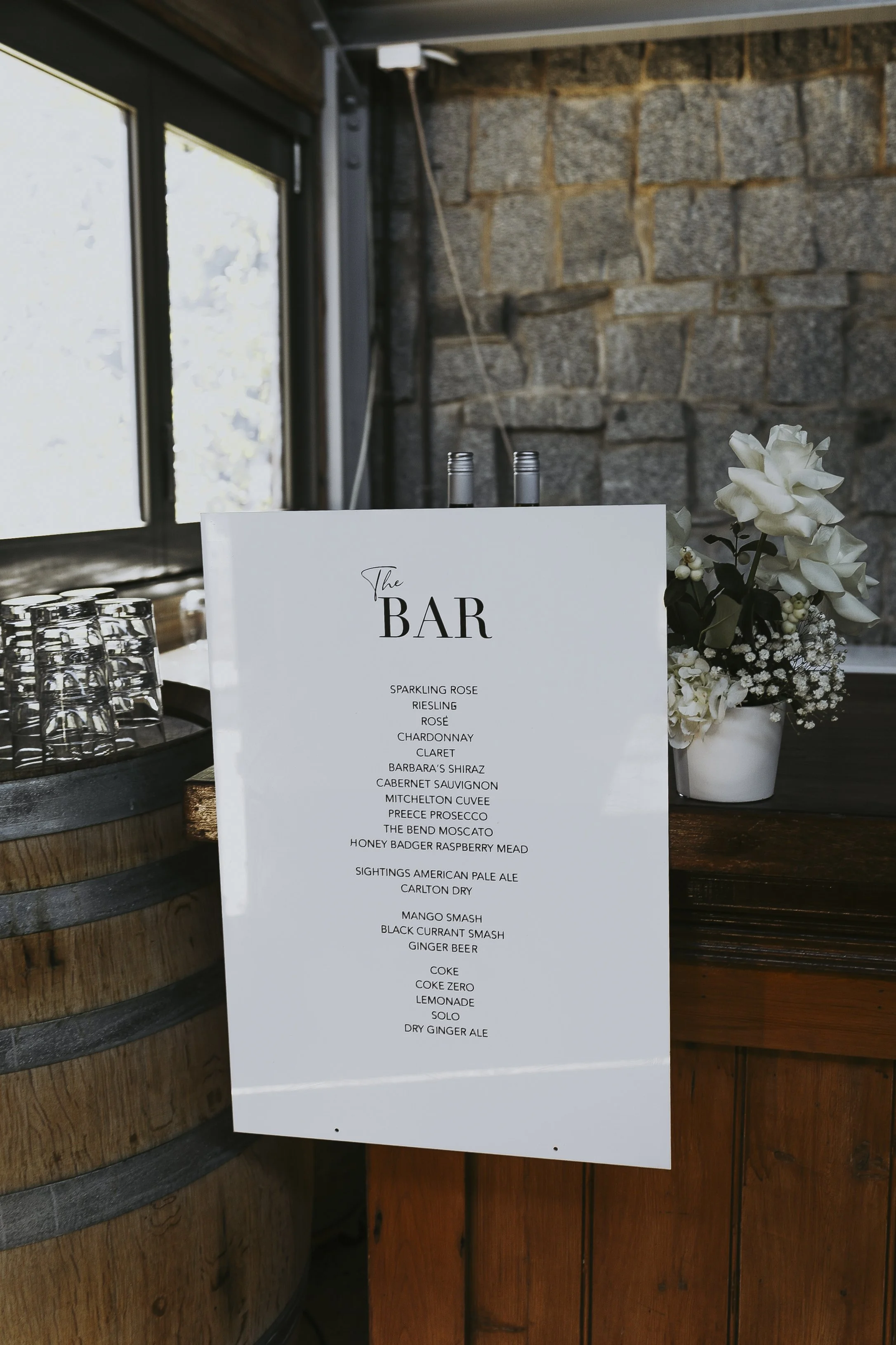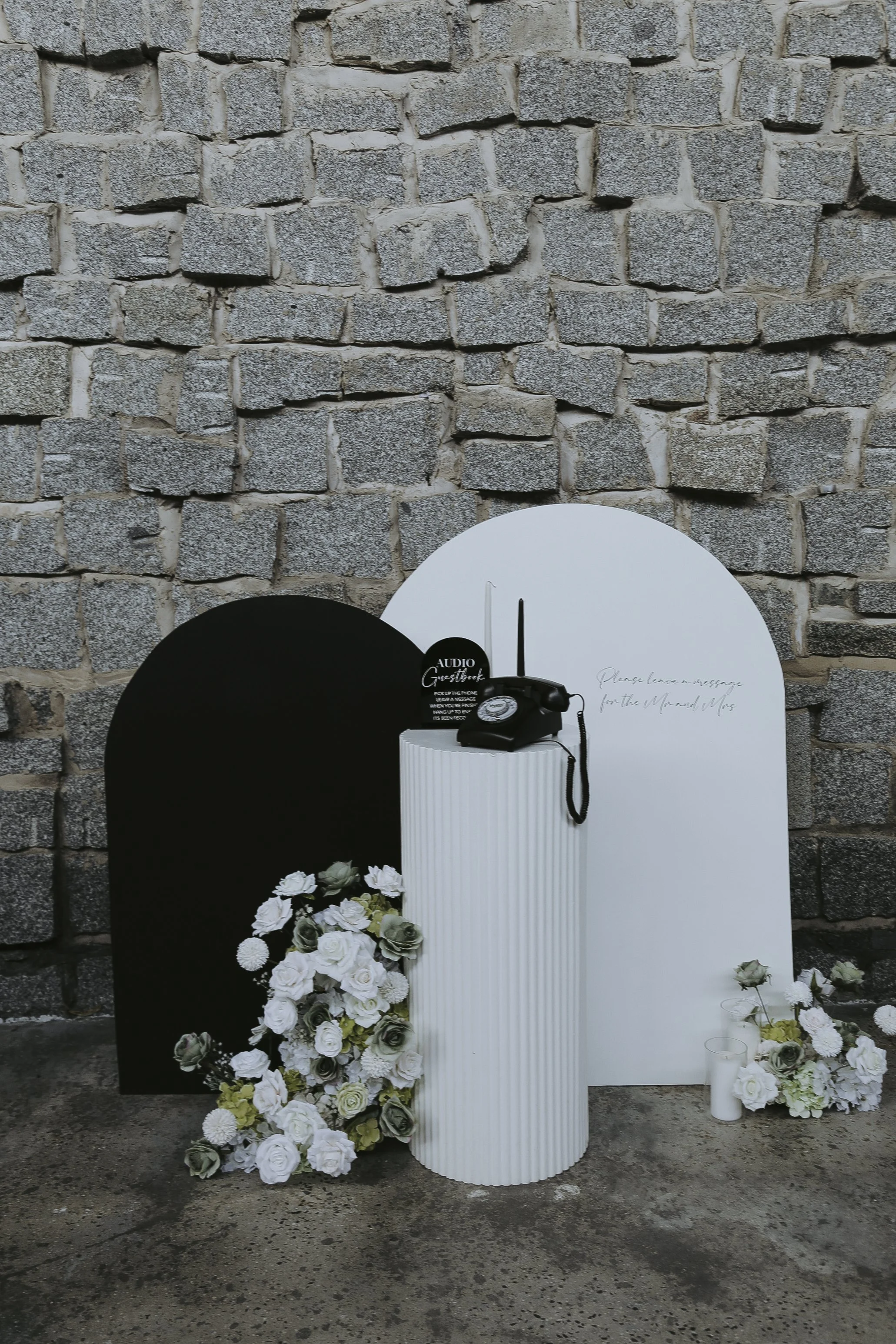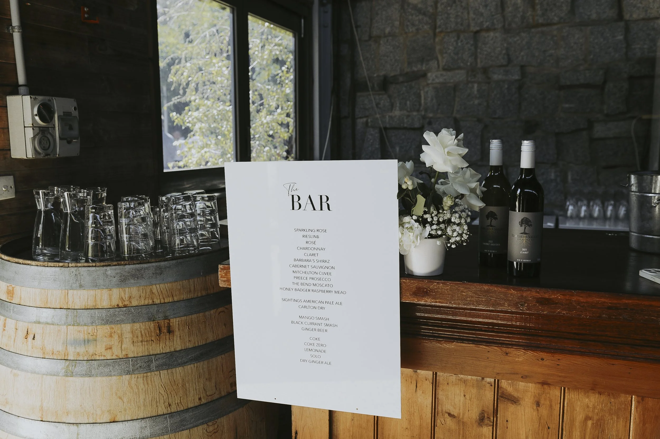 Ebony & MickEb and Mick celebrated their wedding day amidst the picturesque surroundings of Harcourt Valley Winery. It was a joy to capture every moment of their day as their photographer, ensuring their memories were beautifully captured. The hire items really complemented the venues colours and textures, we opted for an Audio Guestbook Arch Duo to hold their phone which blending seamlessly in the space. We also provided a welcome sign, stand, bar sign, and wishing well, all designed to enhance the monochrome style with a touch of green to their special day.