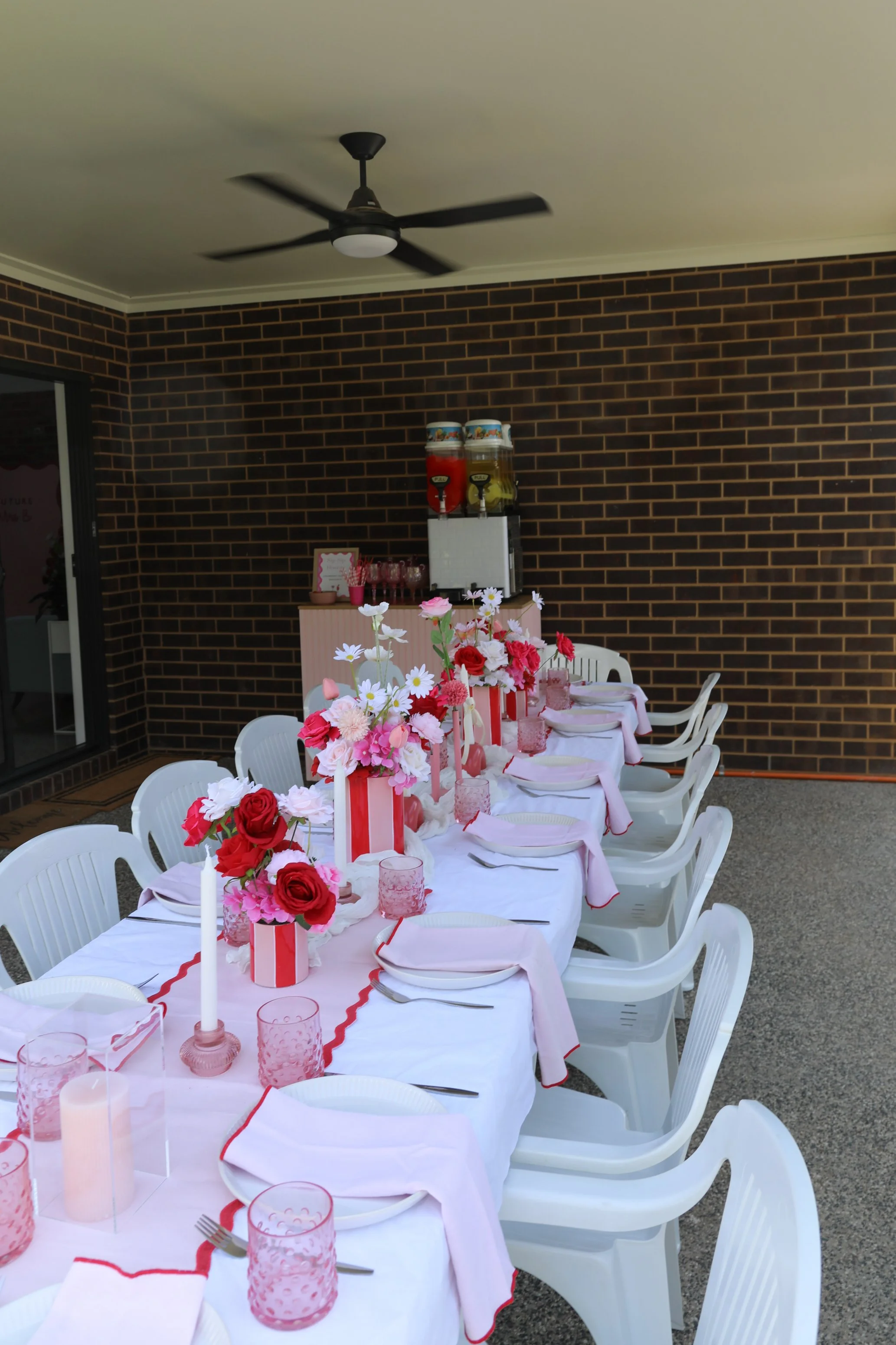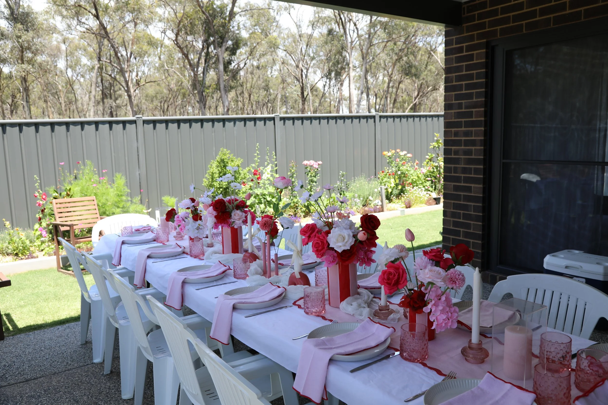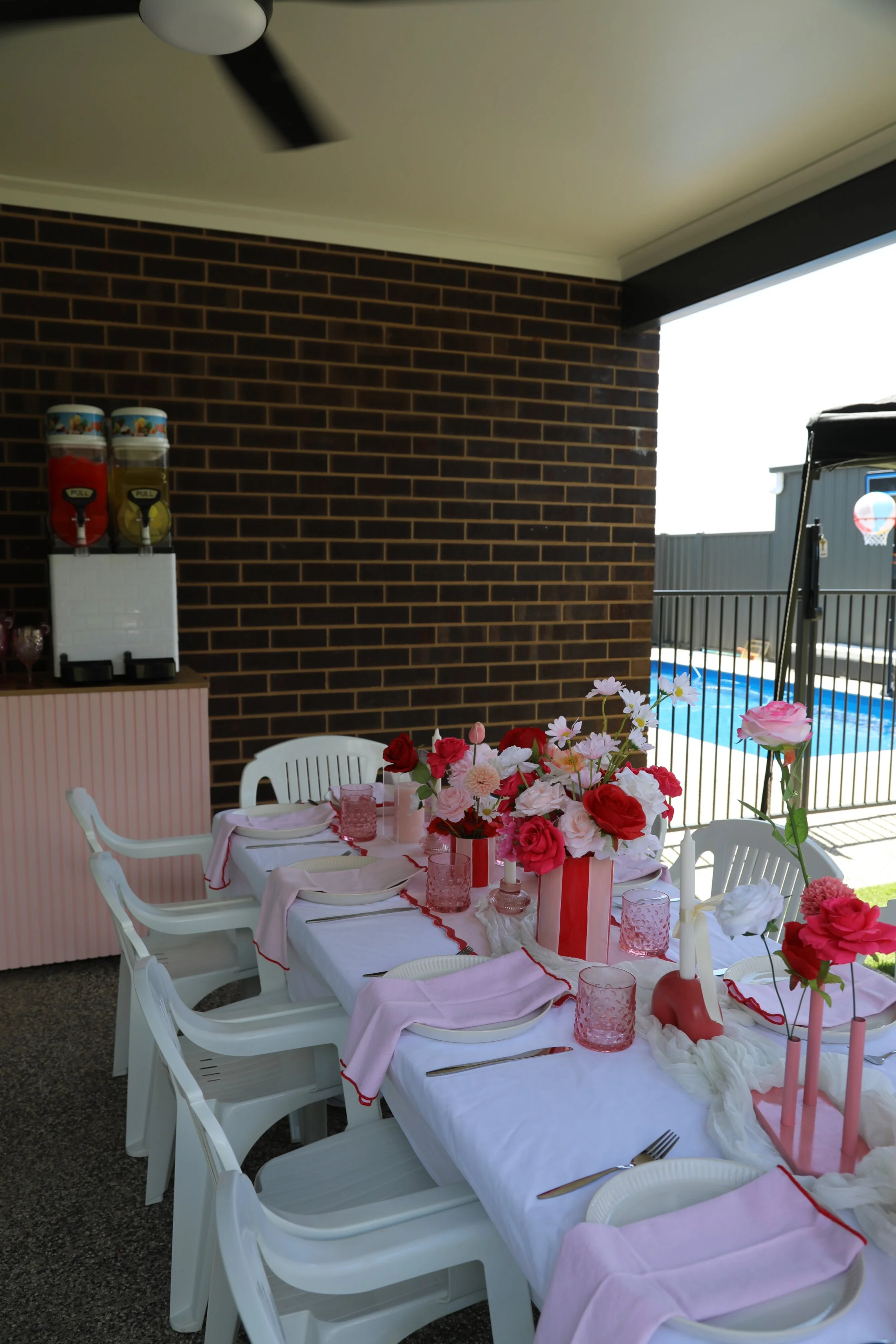I also had the pleasure of doing Ebony’s Hens day, which was hosted at her Maid of Honour's house. We transformed the space with vibrant pink and red backdrops, welcoming signage, and an array of props, creating a lively and fun atmosphere. The highlight was the Pretty In Pink Tablescape, arranged for Ebony and her 15 closest friends and family members. Every detail, from the front door to the backyard, was carefully curated to ensure a seamless and cohesive atmosphere. It was the perfect blend of fun and elegance, making it an unforgettable bridal shower for Ebony.