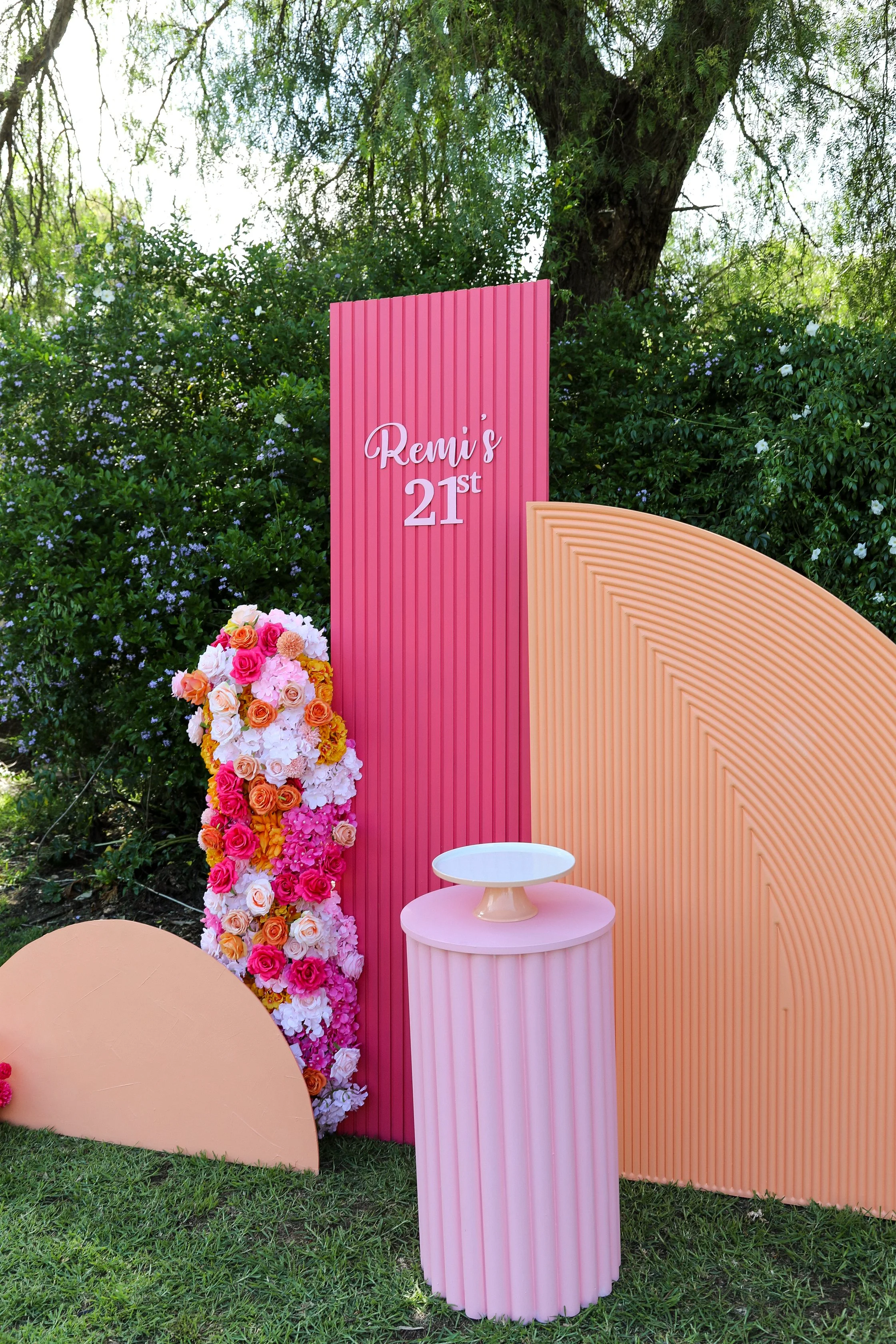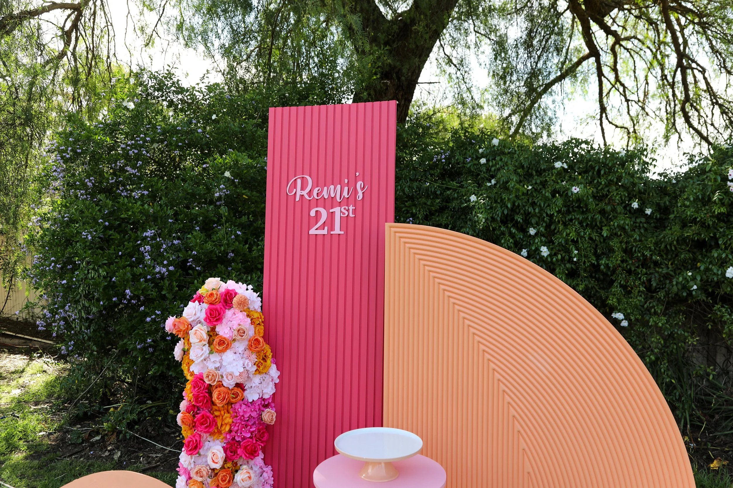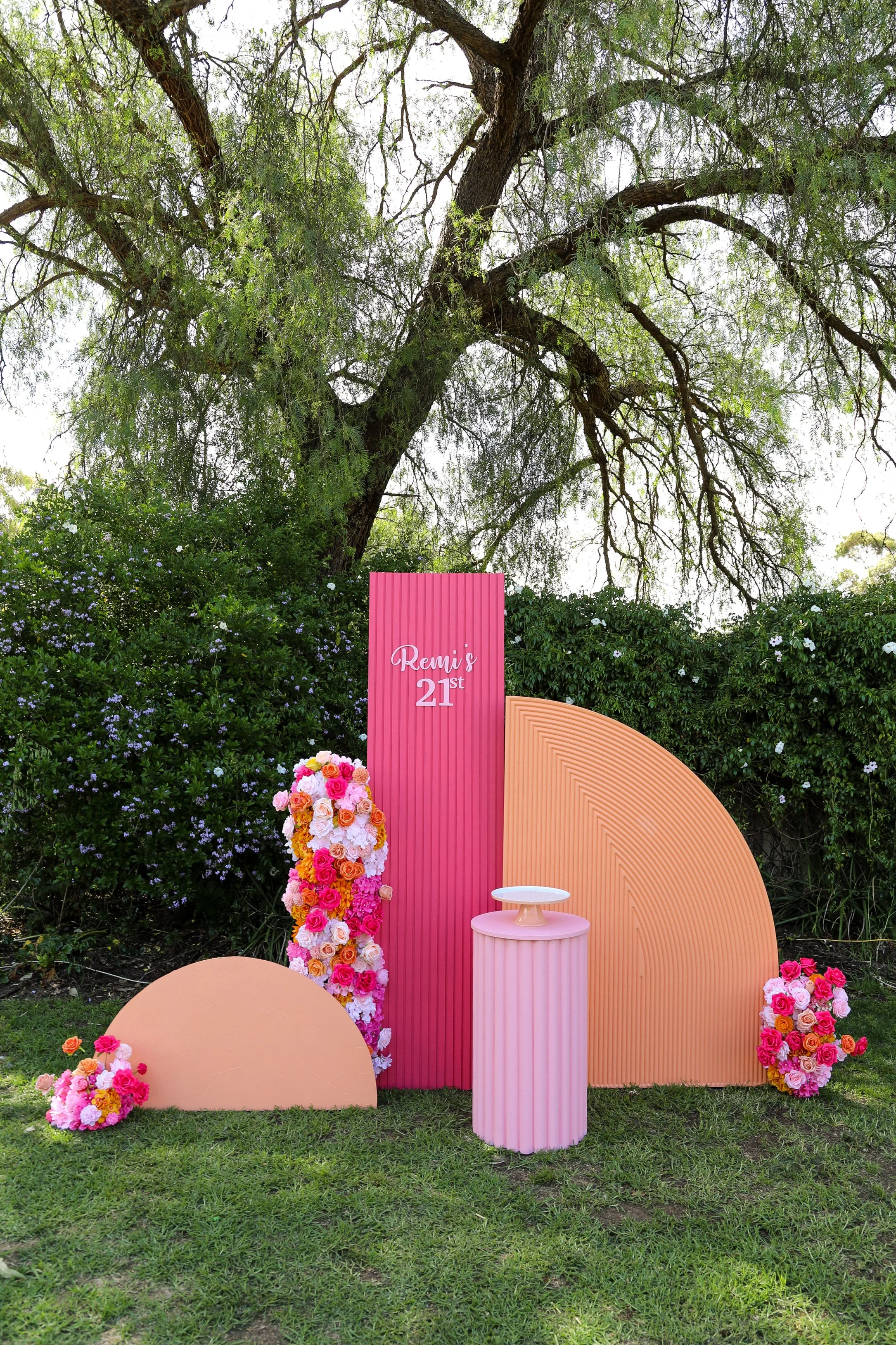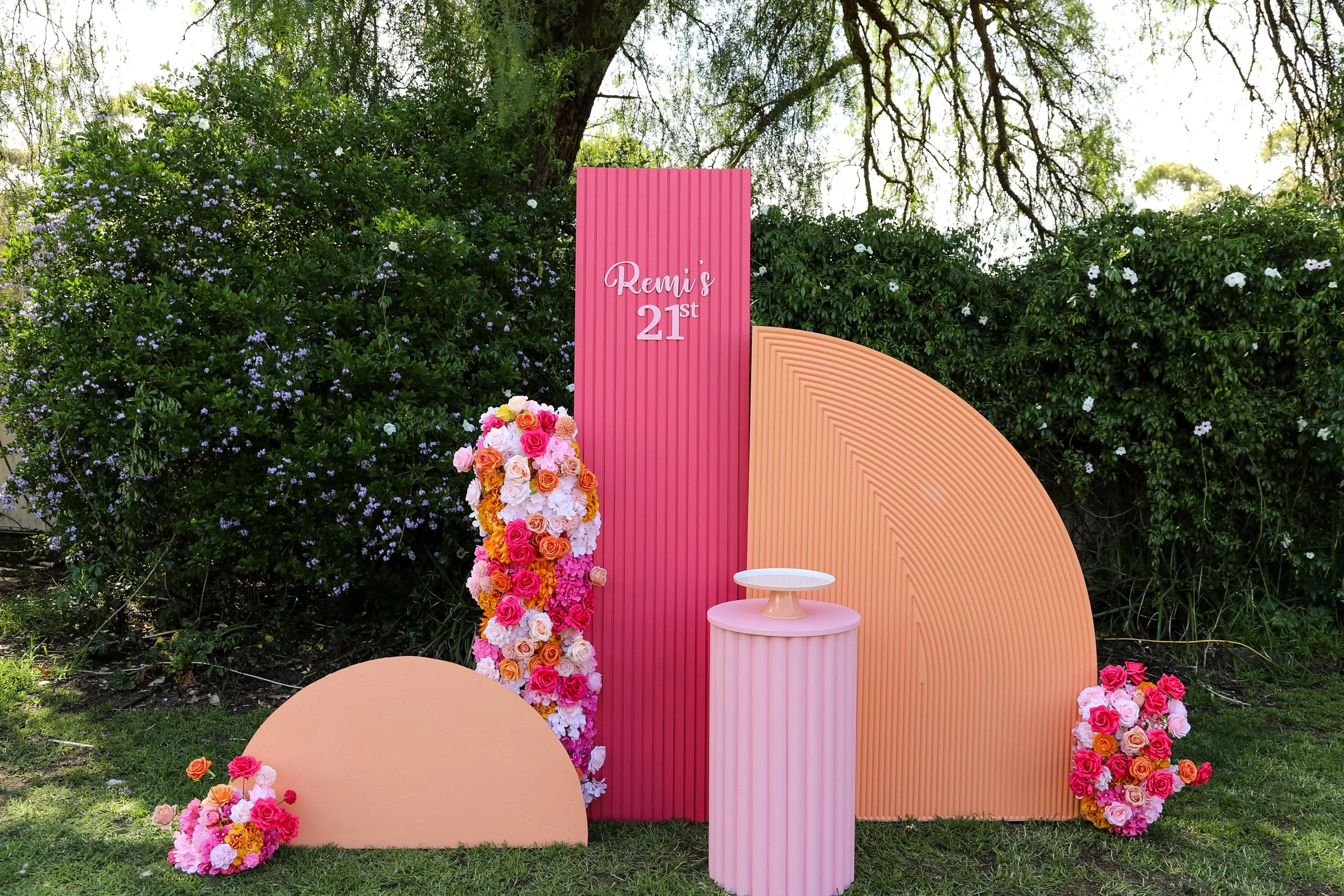 Remi's 21stFor Remi’s 21st birthday celebration, we had the pleasure of designing a fully customised setup that truly captured her vision. After she shared her inspiration with me, I was able to transform her ideas into reality using our array of luxe backdrops and painting services. We opted for the Gold Luxe Backdrop Package, and painted some of our premium backdrops to align with the vibrant and cohesive colour scheme of pink, peach, and coral, perfectly matching Remi’s stunning dress.