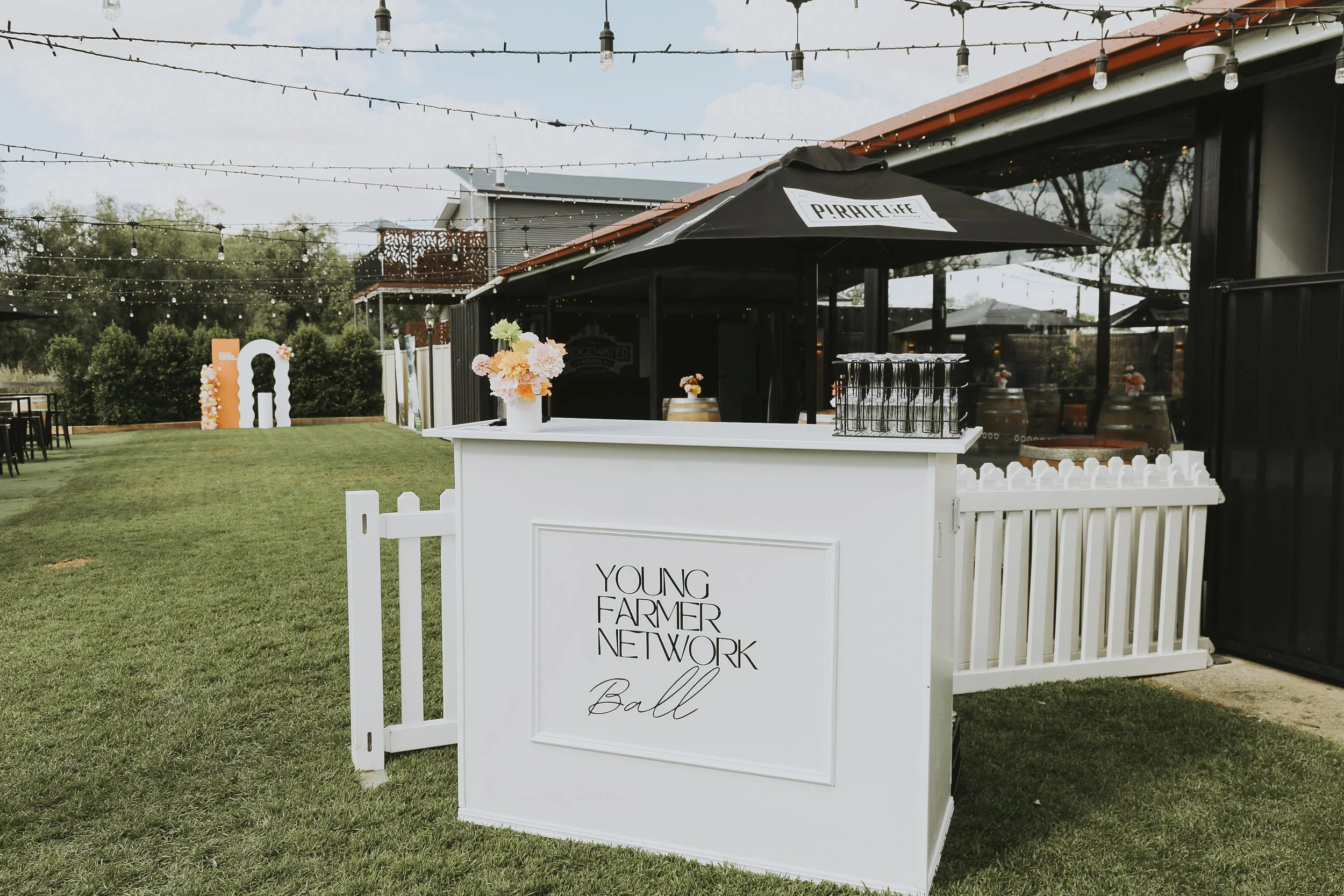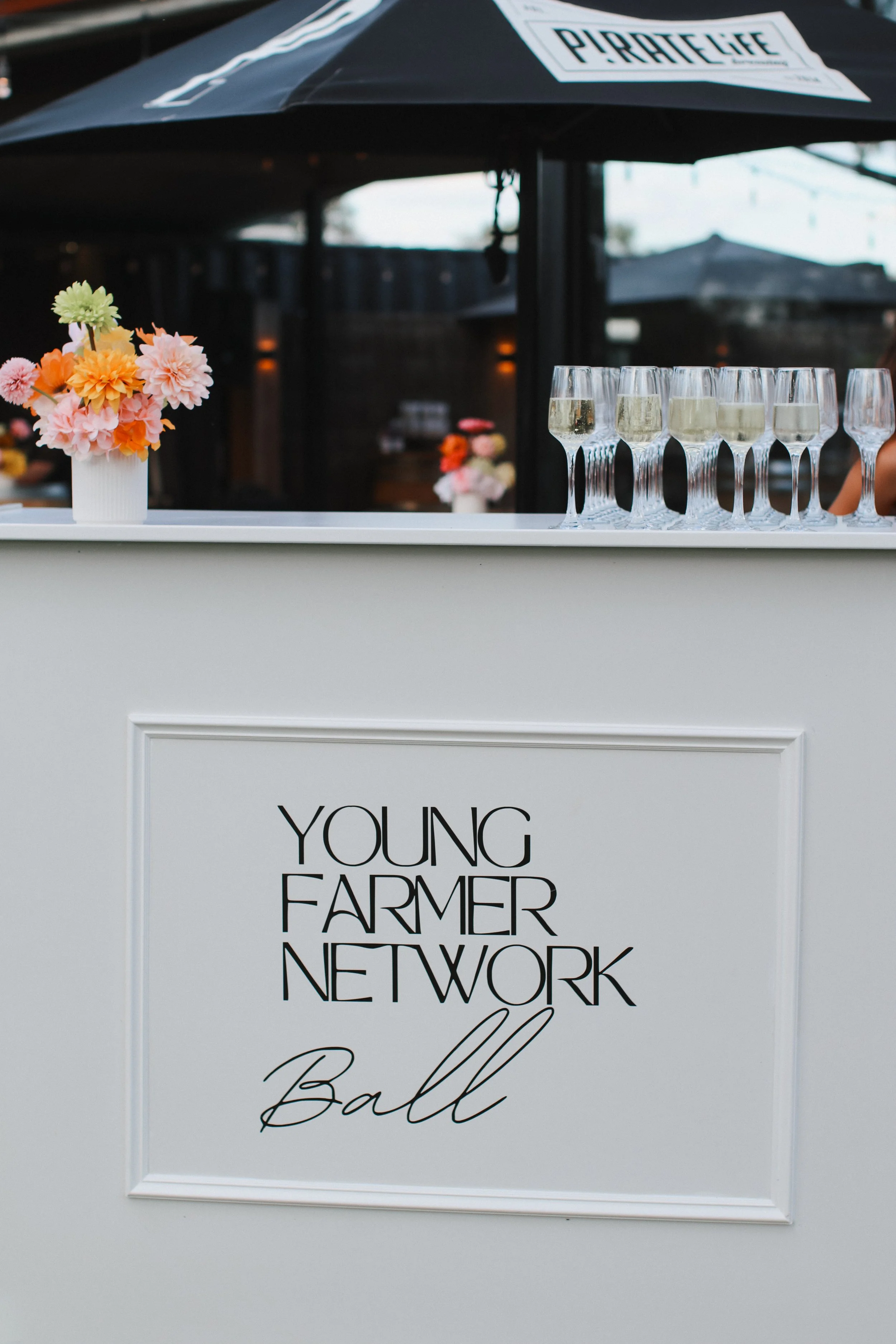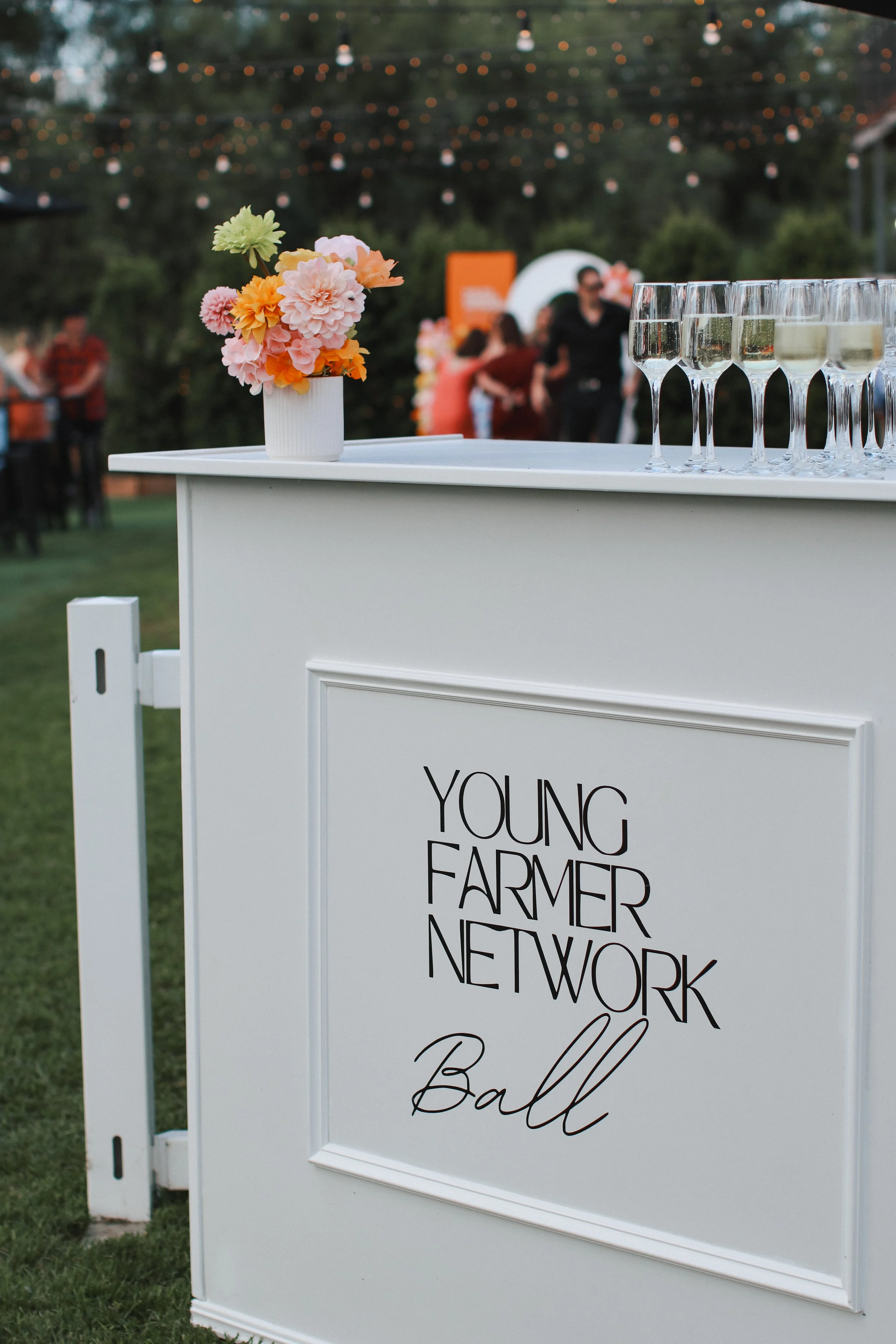 Every aspect of the event, from the custom bar and logo signage to the vibrant photo area and consistent branding, was planned to create a memorable and seamless experience for the Young Farmer Network Ball at the Bridgewater Hotel.